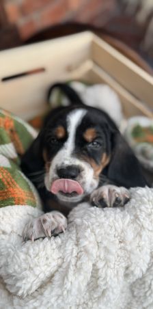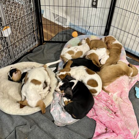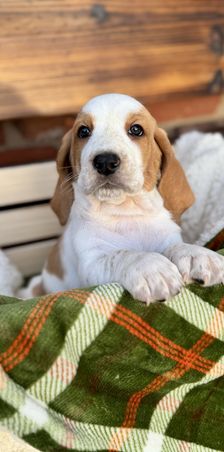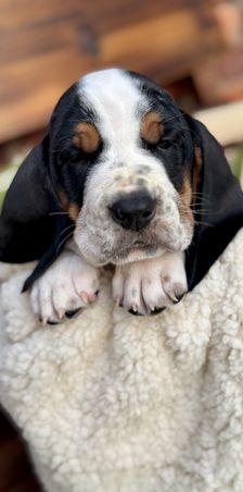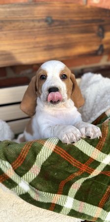 Her temperament is just as remarkable as her appearance—she is affectionate, nurturing, and devoted, both with her family and her puppies. She has a calm and gentle nature, yet carries the playful curiosity that makes Basset Hounds so endearing. With strong health clearances and proven lineage, she consistently passes on her outstanding qualities of soundness, temperament, and beauty to her litters.
