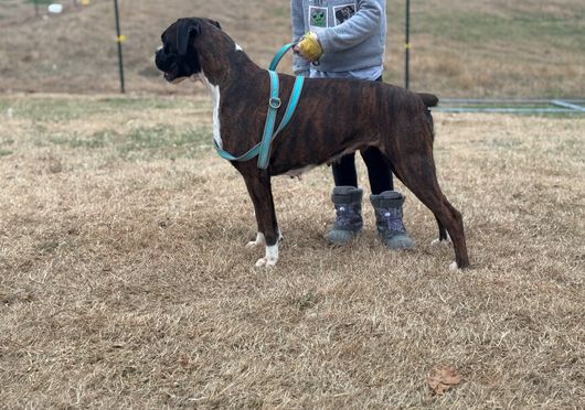Royal is our Gorgeous Flashy brindle girl ! She has an amazing temperament, and gets along with everyone ! She also has Clear Echocardiogram by Board Cardiologist, and tested for ARVC/DM.