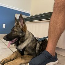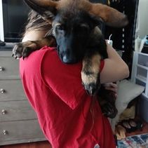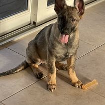 Cinder is a female German Shepherd. Carefully selected as a great representative of her breed, Debby decided to make her part of their program. Debby has passed Good Dog’s screening process, which involved a review of their breeding practices, environment, and the mental and physical health of their dogs.