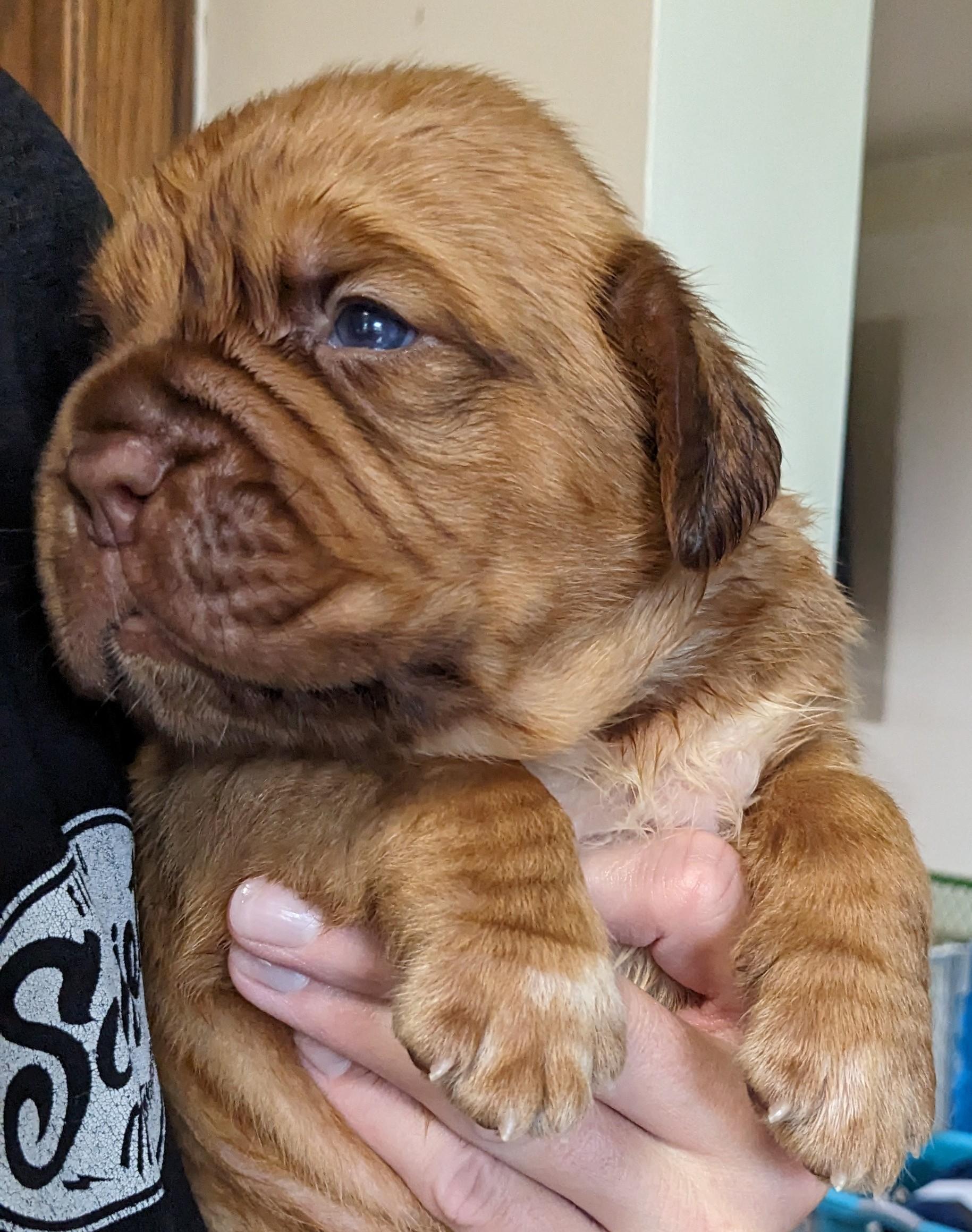 Gemma is a female Dogue de Bordeaux. Carefully selected as a great representative of her breed, Toni decided to make her part of their program. Toni has passed Good Dog’s screening process, which involved a review of their breeding practices, environment, and the mental and physical health of their dogs.