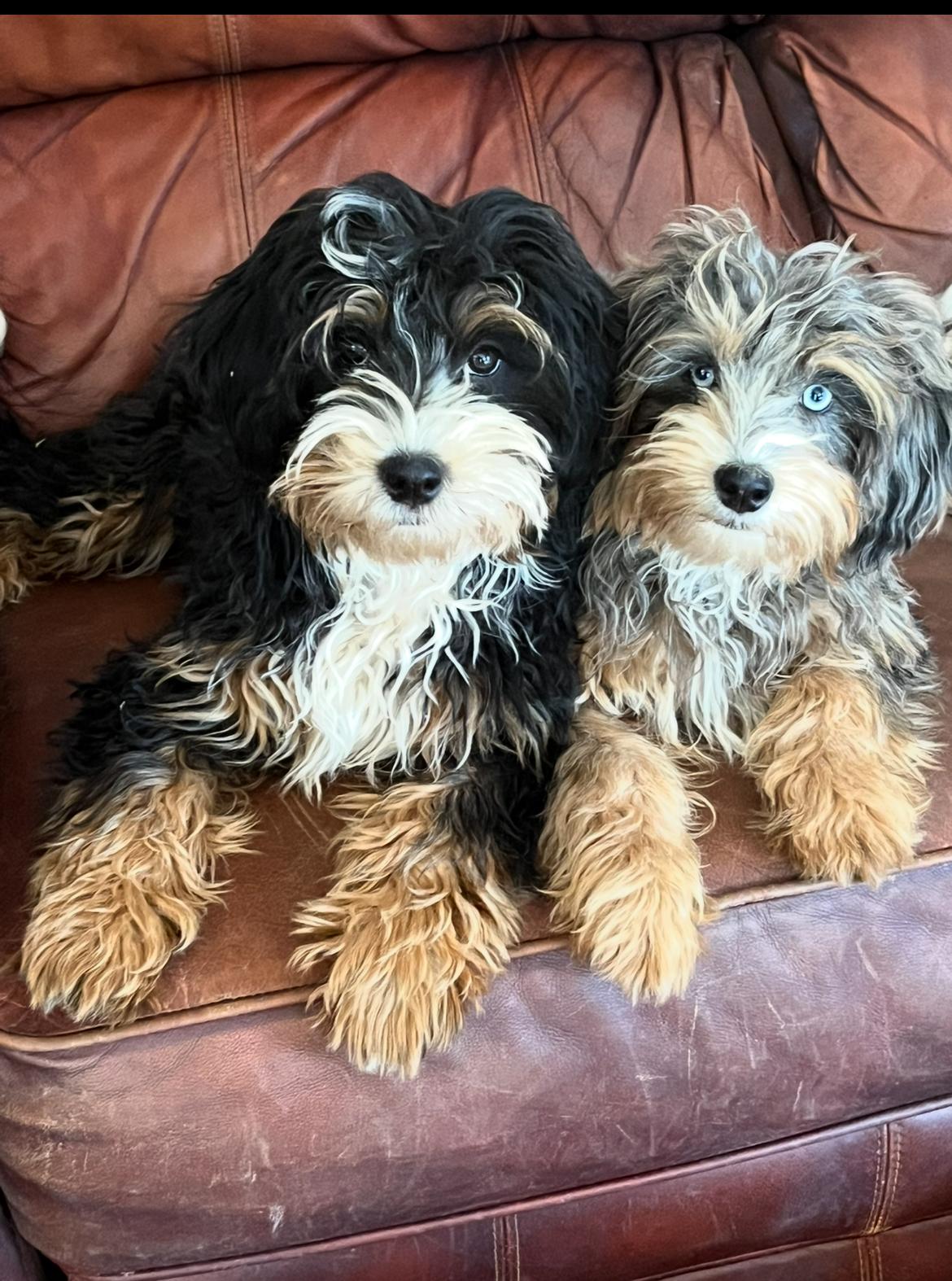 Our Bernedoodle puppies include tri-color and blue merle. Bernese Mountain Dog puppies are black and rust. Colors will vary depending on the parent dogs.