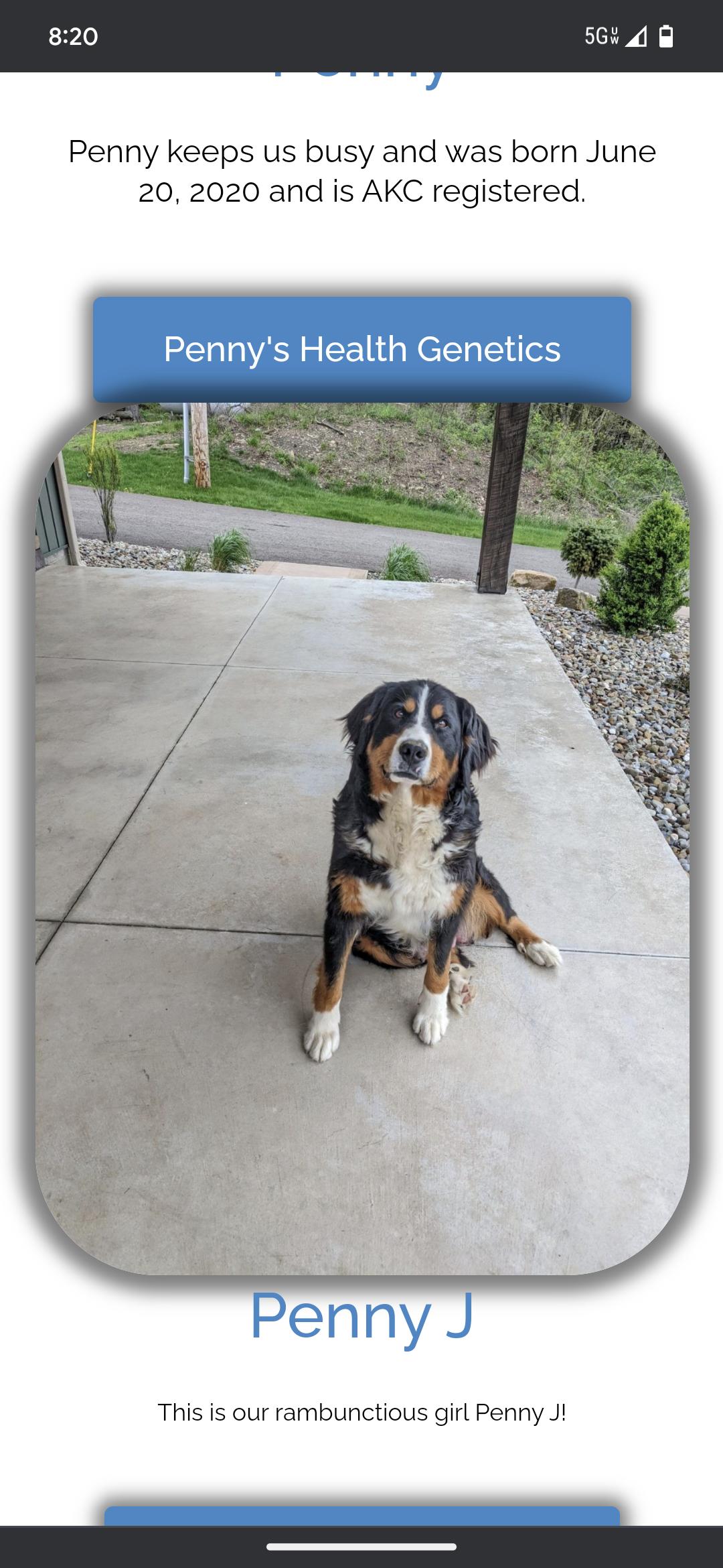 Penny is a female Bernese Mountain Dog. Carefully selected as a great representative of her breed, Nicholas decided to make her part of their program. Nicholas has passed Good Dog’s screening process, which involved a review of their breeding practices, environment, and the mental and physical health of their dogs.