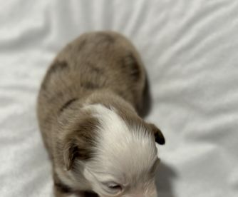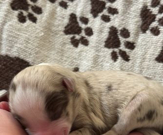 Pearl is a gorgeous, well mannered Red Merle. She has a great temperament with adults, children and even cats! Pearl is a small Mini.