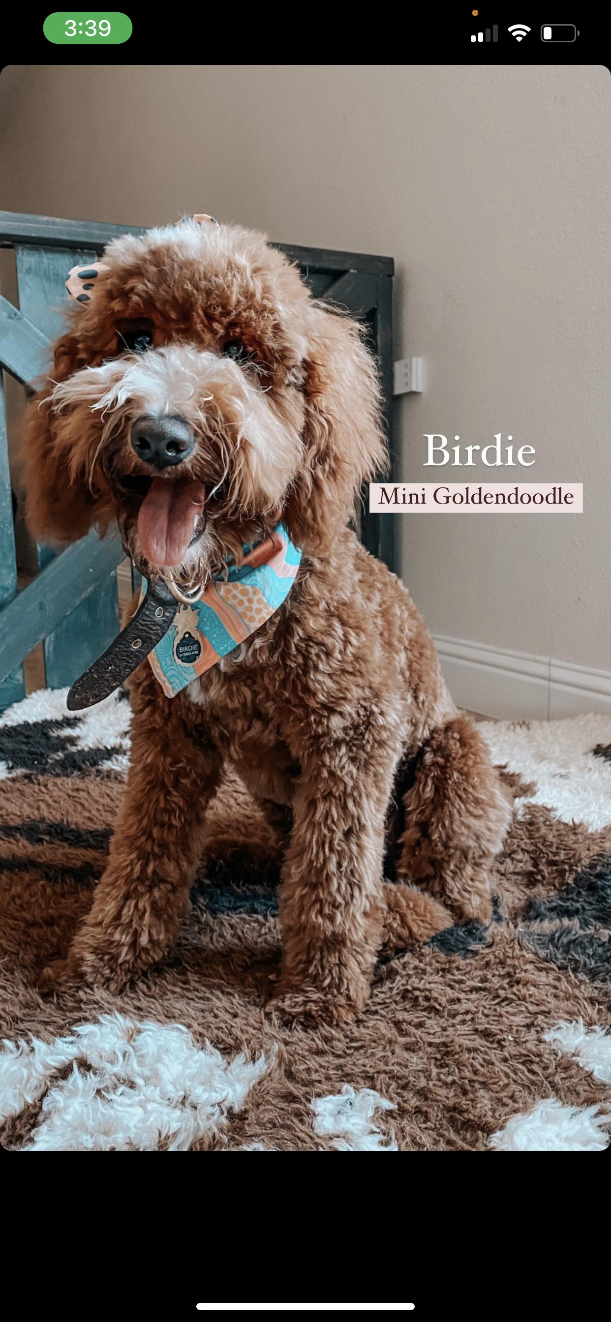 Birdie is a female Goldendoodle. Carefully selected as a great representative of her breed, Karina decided to make her part of their program. Karina has passed Good Dog’s screening process, which involved a review of their breeding practices, environment, and the mental and physical health of their dogs.