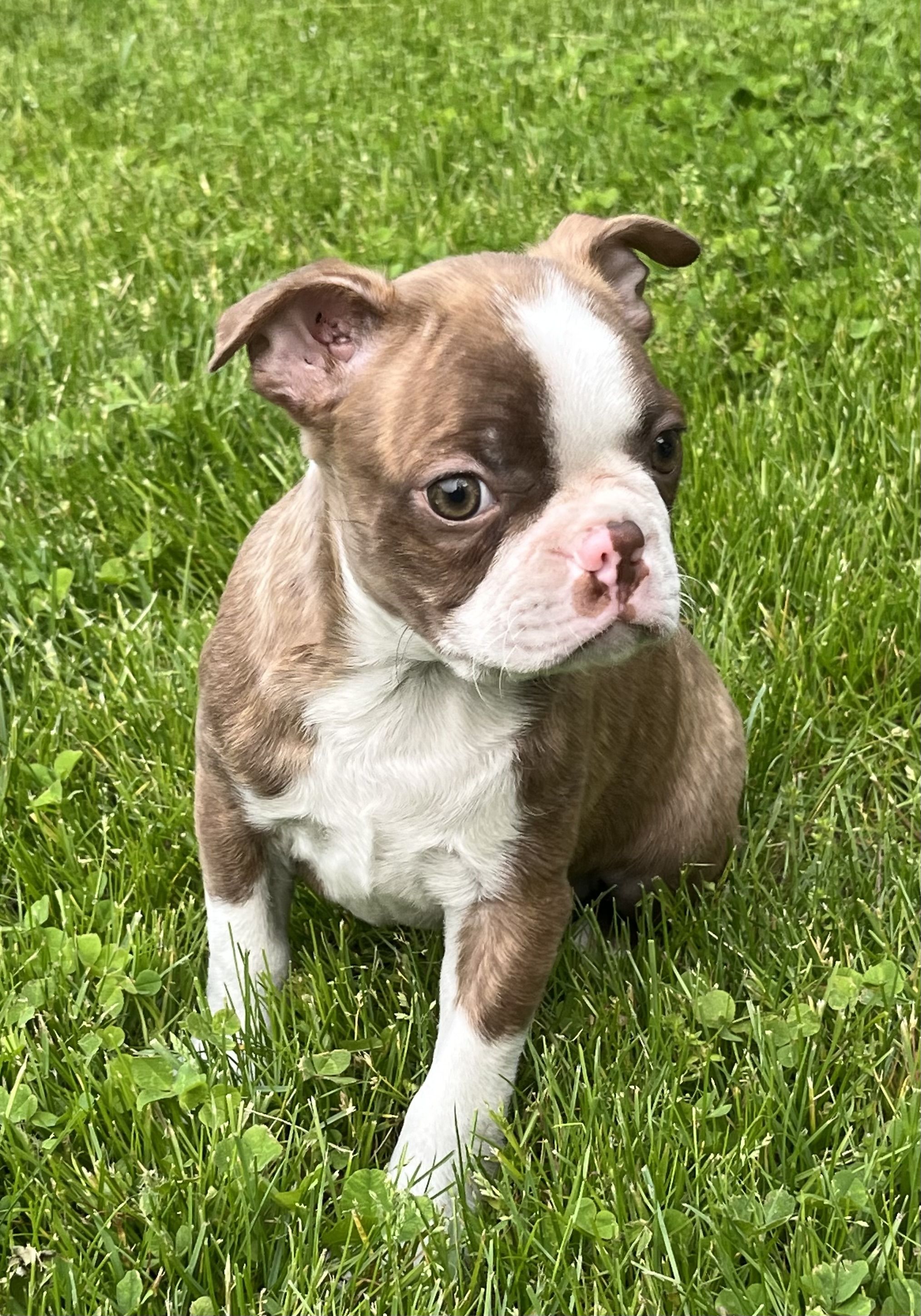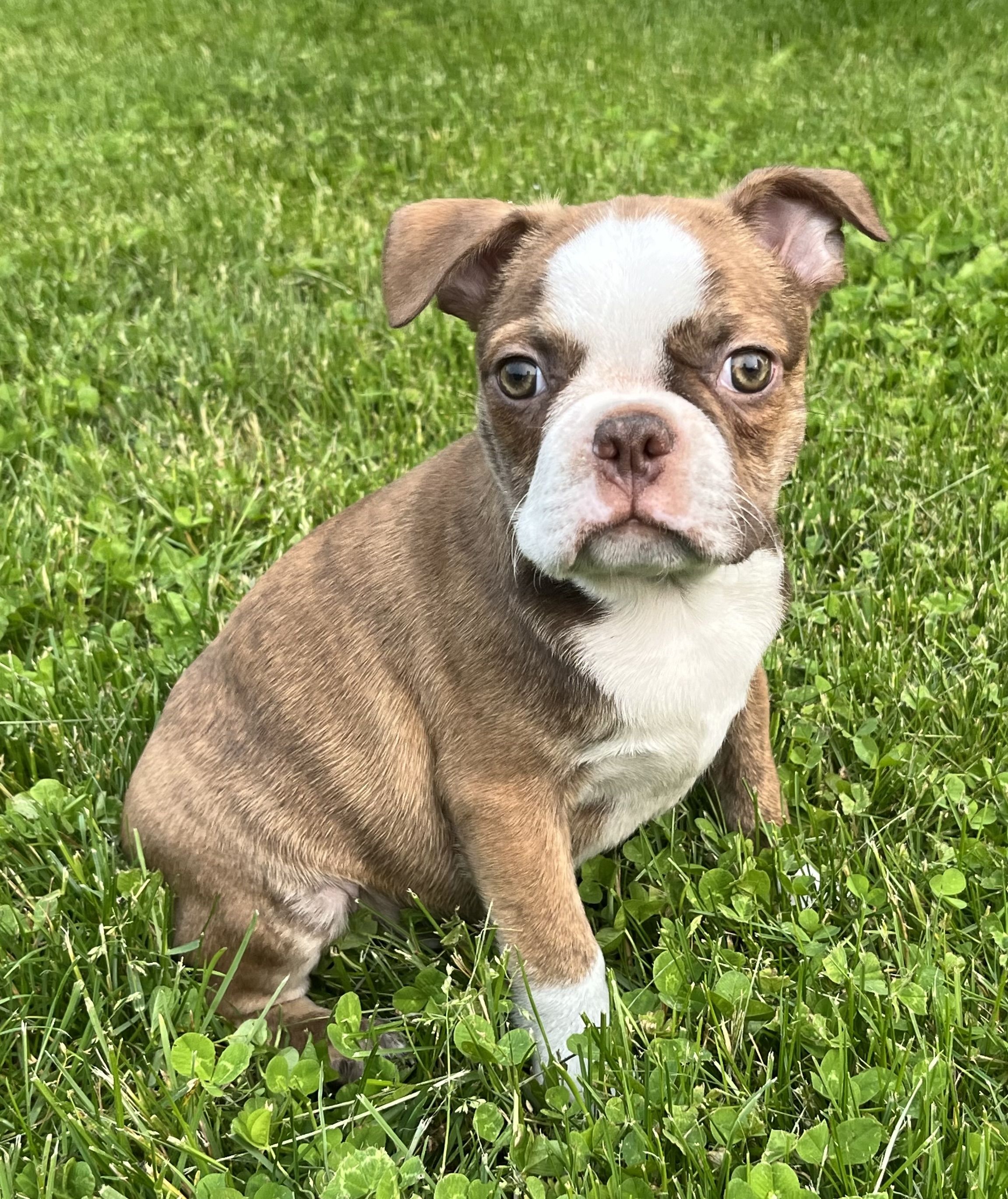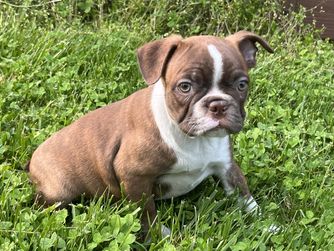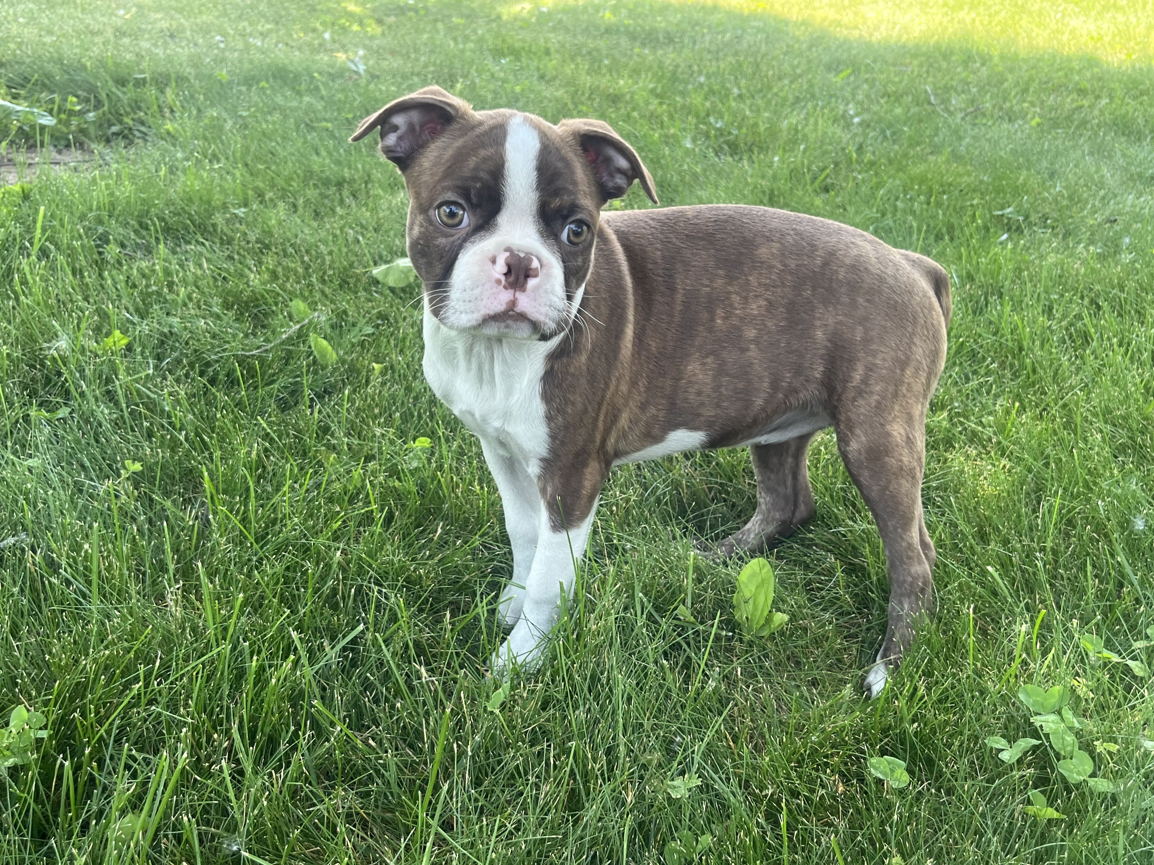 Tiki is a beautiful AKC fawn Boston and she’s the best mother ever! She loves to play with other dogs and get super excited for her treaties. Tiki is 3 generations from our own bloodlines meaning we owned her parents and grandparents. She is fully OFA health tested with CHIC numbers, DNA tested through Embark and she also carries the tri/tan point gene.