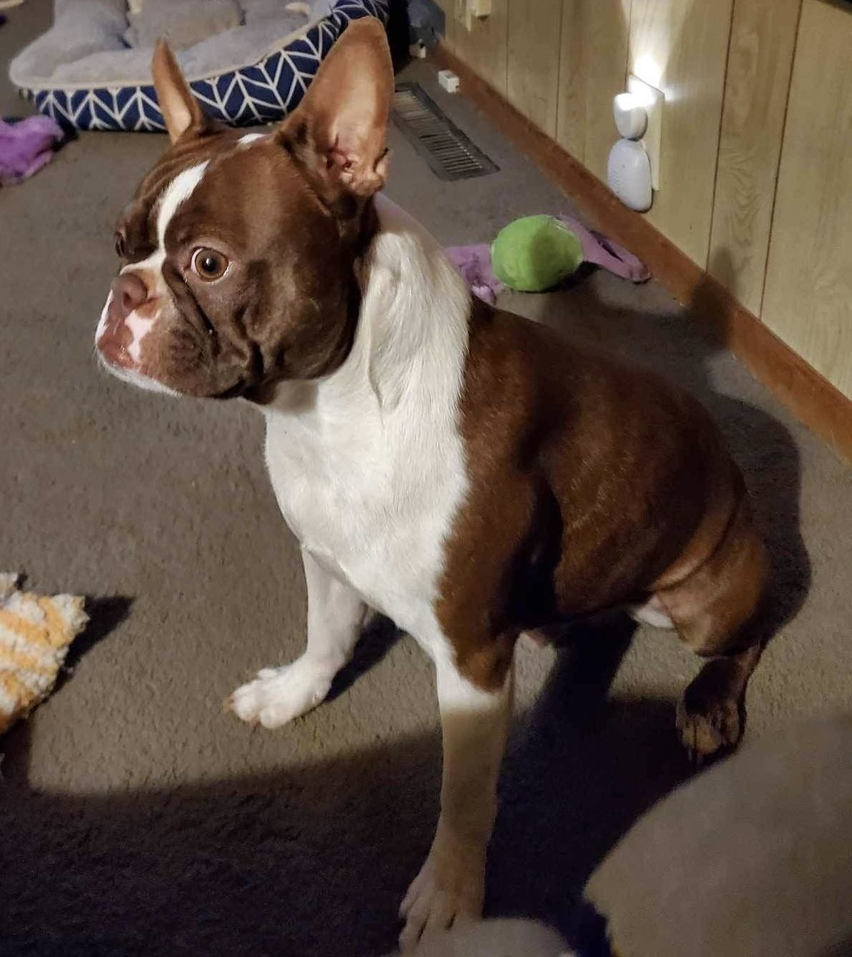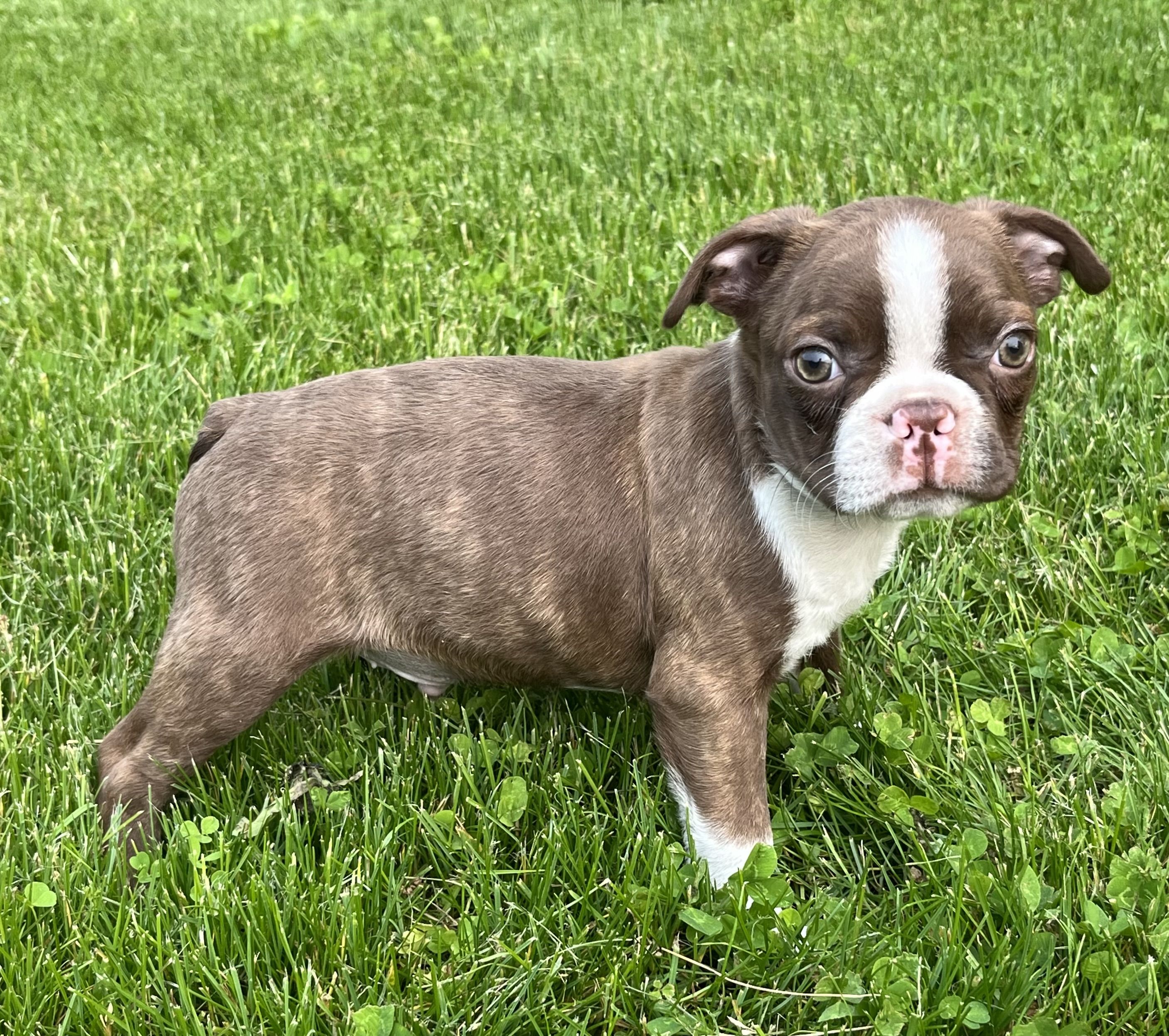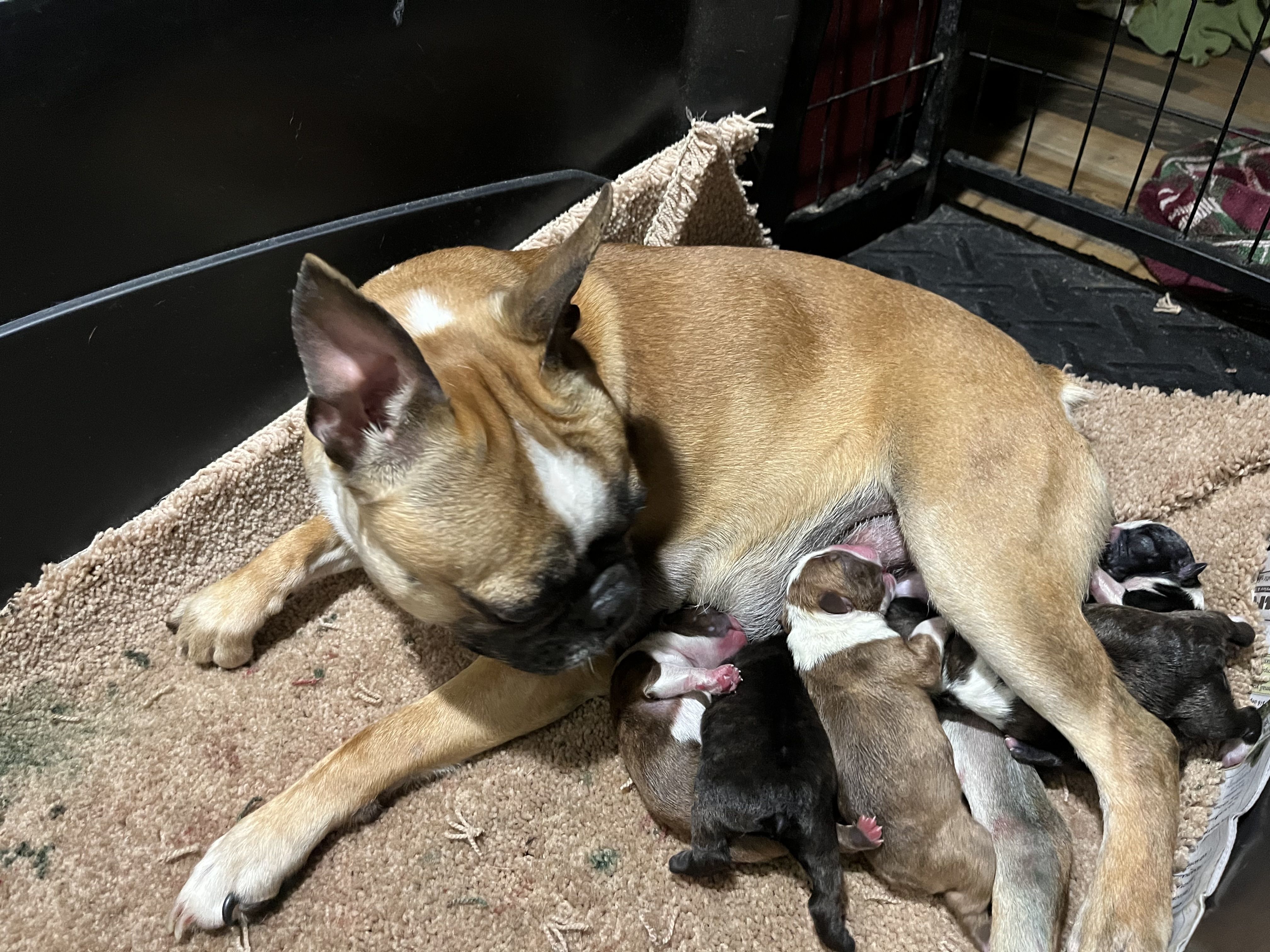 Tiki is a beautiful AKC fawn Boston and she’s the best mother ever! She loves to play with other dogs and get super excited for her treaties. Tiki is 3 generations from our own bloodlines meaning we owned her parents and grandparents. She is fully OFA health tested with CHIC numbers, DNA tested through Embark and she also carries the tri/tan point gene.