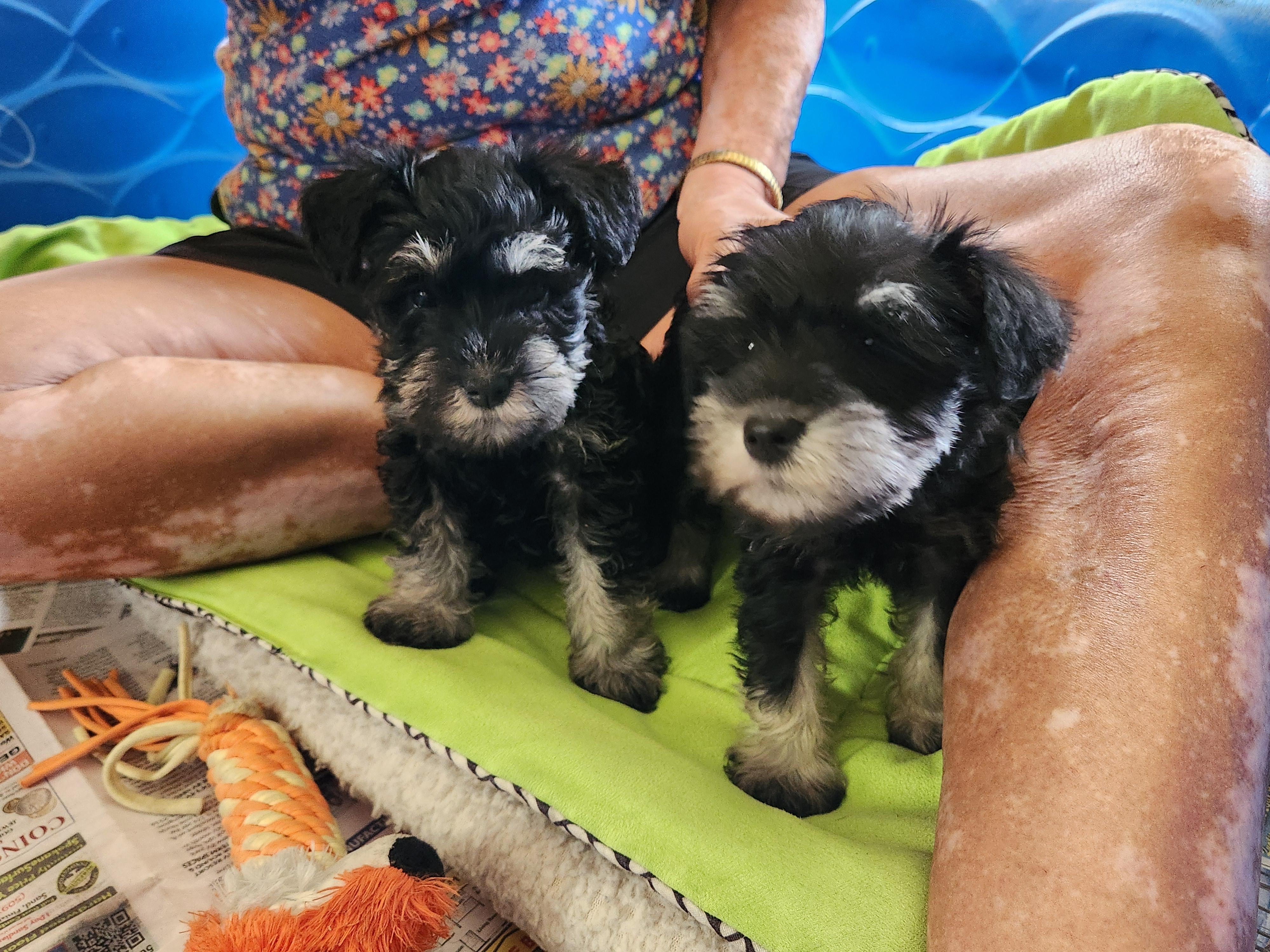 Miniature Schnauzer puppies include salt and pepper, black and silver, and black. Colors will vary depending on the parent dogs.