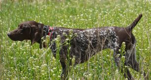 Sage is a good looking 55 lb female - liver & white, patched & ticked, standing 26 inches. She comes from a line of Deutsch Kurzhaars tested by DKV and NADKC. Several of her great grandparents earned the highly prestigious Kurzhaar Sieger or “KS” title that is added to their name. She is a quick learner and has fantastic prey drive with a fabulous off switch resulting in her being both a great hunting dog and an outstanding companion. She is bold and confident, able to show independence in the field while normally being obedient and naturally cooperative.