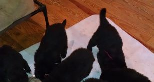 Pups are home raised and extremely well socialized. They are born in our home and are with us 24/7 experiencing all the sights and sounds of our home. They are introduced to other dogs and cats. As a trainer, I start working with them as soon as they are walking. We have a puppy playground that they can explore and they have access to indoors and outdoors, weather permitting.