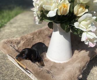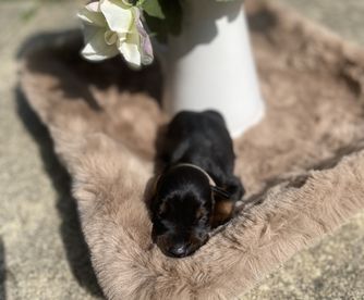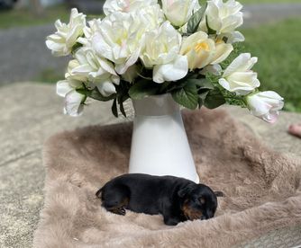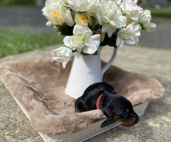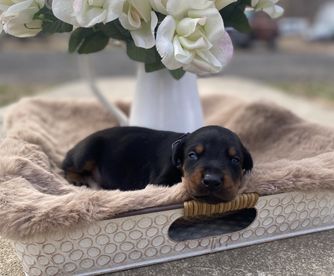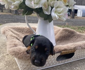 Our puppies include black and rust, blue and rust, and red and rust. Colors will vary depending on the parent dogs.