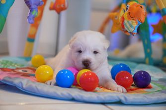 Our puppies include red and white, white, and black. Colors will vary depending on the parent dogs.
