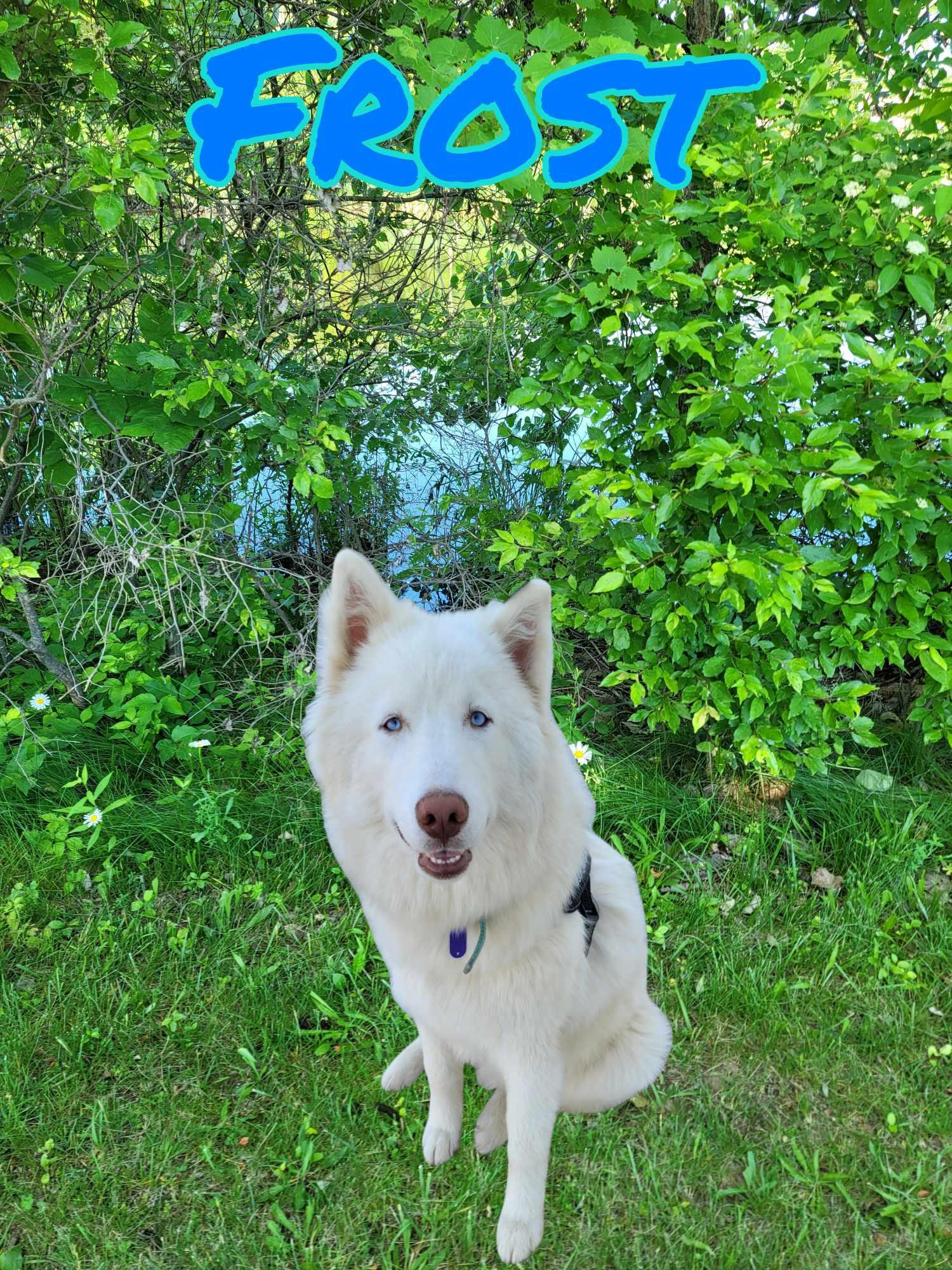 Frost has always been a big lover!! He has never been one to bark. He does love to howl when he gets excited. He has always been on the shy side. He will let the others come say hello first and he will sit back and watch. Once they seem happy with you, he will slide in to get his pets also. The next time you come over, he will make right up to you!