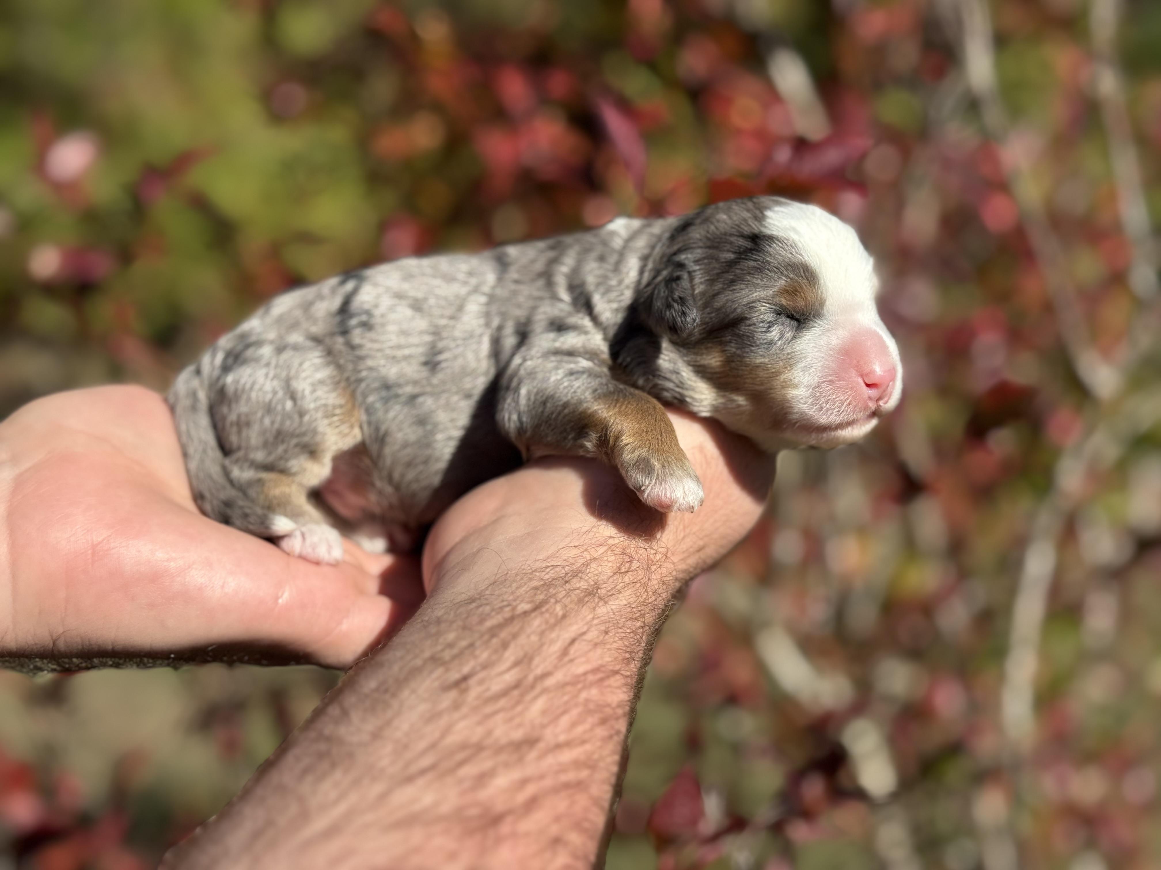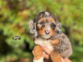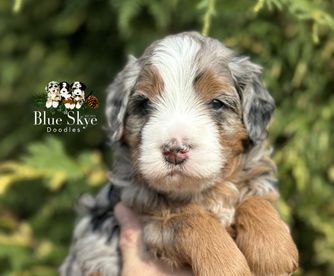 Roulette “Roo” is a gorgeous blue merle tricolor Bernedoodle from our own lines. She is fully furnished and has a beautiful, super soft, straight coat. Amazing markings and great copper. She is as sweet as she is pretty.