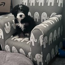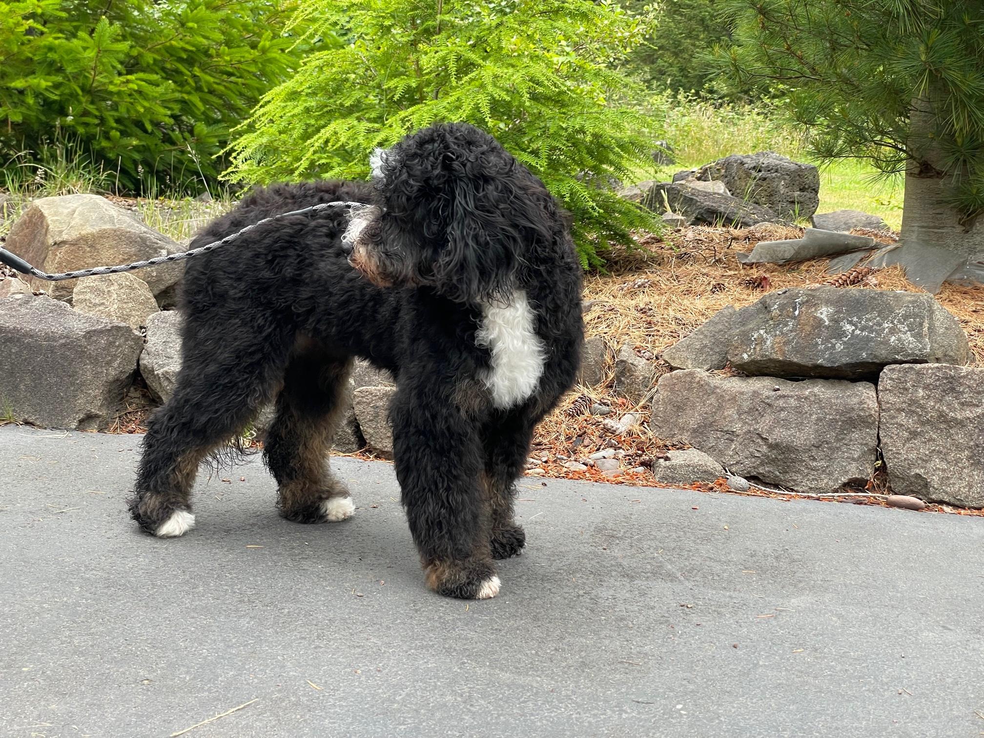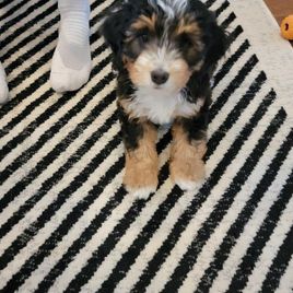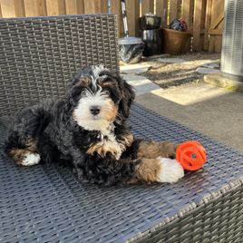 Westley is a small mini, multi-generational Bernedoodle from our own lines. He is extremely sweet with a great temperament. He is fully furnished with a straight coat and clear genetics. Good hips & elbows. Gorgeous dark, non-fading black and copper points.