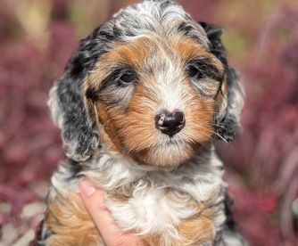 Our Bernedoodle puppies include tri-color, blue merle, and merle. Colors will vary depending on the parent dogs.