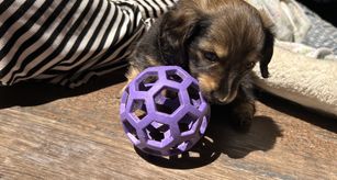 Letty is a gorgeous, small AKC-registered miniature dachshund with a sleek shorthaired cream-based brindle coat that makes her look like a little princess. She’s full of sass and spunk, always ready to play and explore, yet she’s overflowing with love and affection for her people. Letty’s playful spirit, bold personality, and sweet heart make her the perfect blend of lively and loving — a true brindle beauty with a big personality in a tiny package.