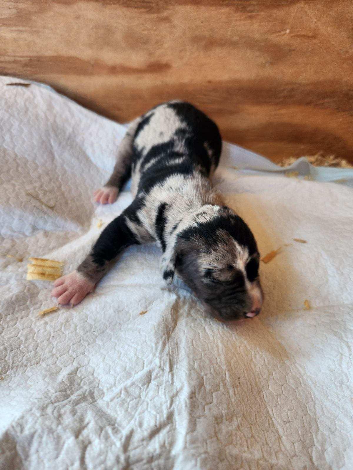 Midnight has the perfect confirmation. She is a beautiful shiny black houla with white markings. Midnight is very friendly and loves to play. She has been the best mom, allowing us to do whatever we need to with her babies.