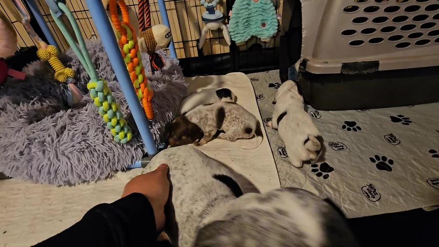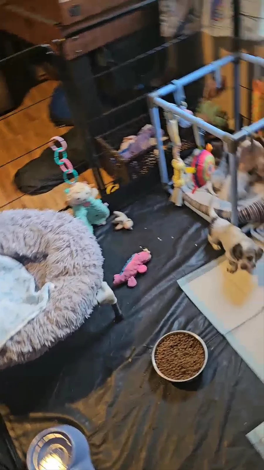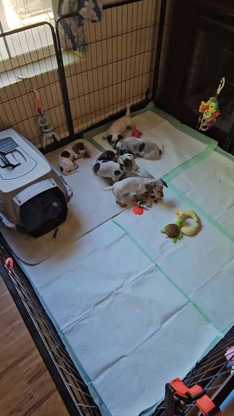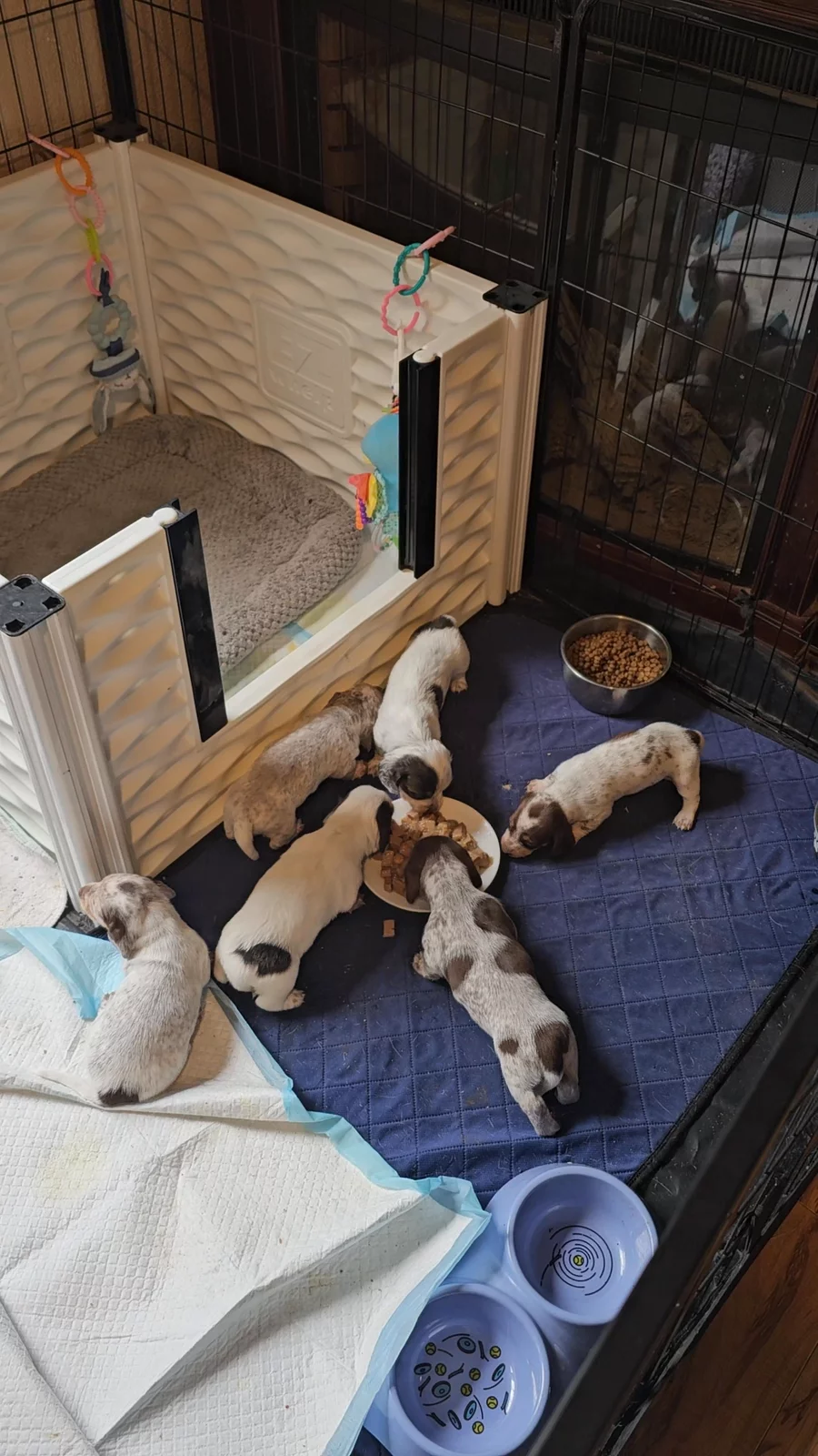 Puppies and mom got an upgrade so they will have so much room. They also tried wet food for thr first time this morning. Some tried it some not so sure. And mommy Nova happily came into finish it.
