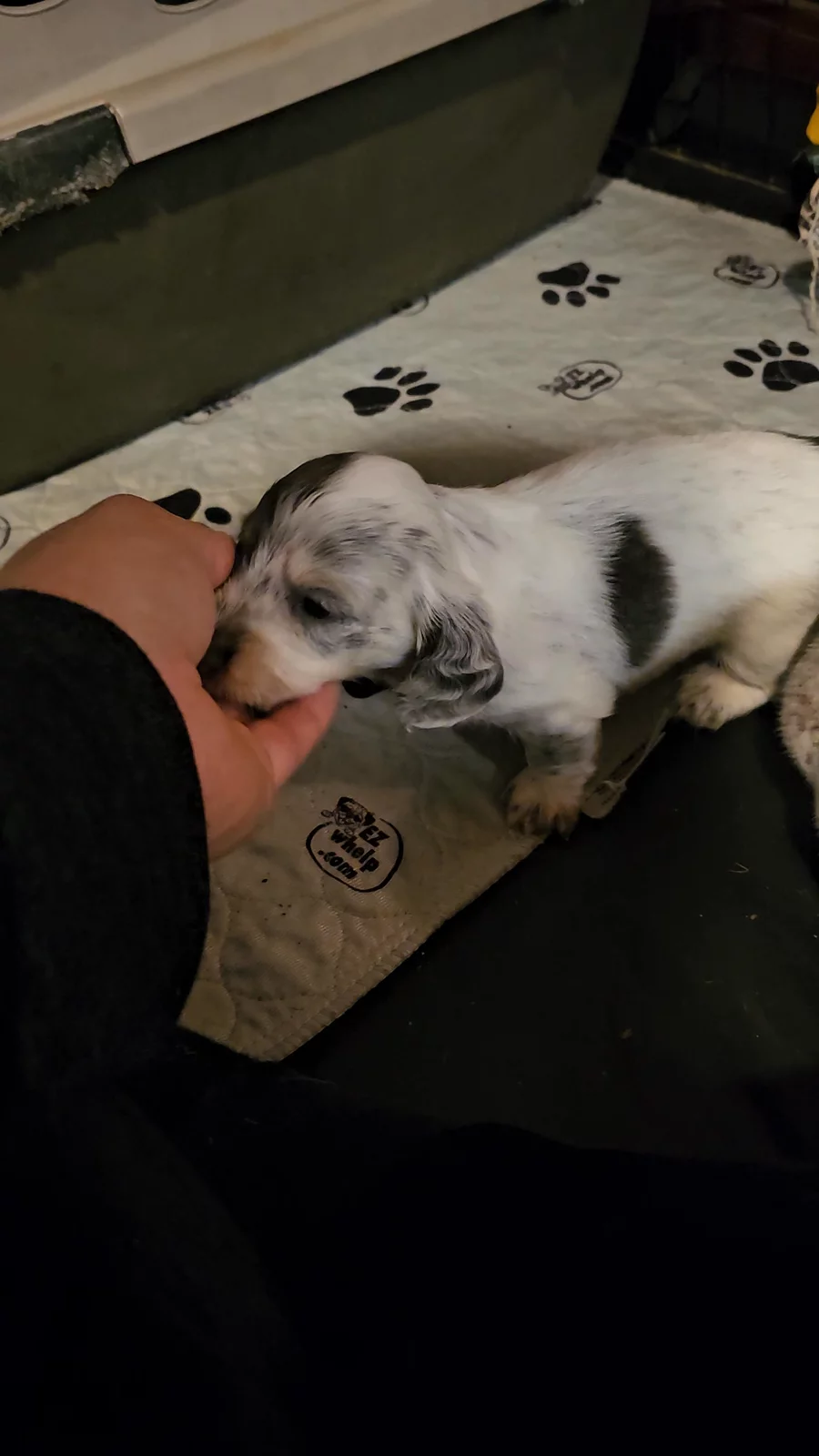 Meet KC. He came from Kansas city hence his name. He's a beautiful mini long haired chocolate and tan piebald heavy ticked dachshund. He's very sweet and just wants to be with you. Loves kids cats and other dogs. As well as going for car rides. KC is our new stud and will have babies from him in 2026. He has had his dna genetic testing done through Akc.