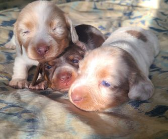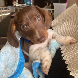 We had a great experience working with Nikole and Bluegum Dachshunds! After we picked our pup, we were sent pictures and videos of him growing up until he was ready to come home. Our pup Bert (Hudson) has been home a week and has barely had any accidents, has been great with crate training, and is so sweet and social. We also have cats, and appreciate that he grew up socializing with cats and knows how to interact with them. Overall we are so happy with our pup!