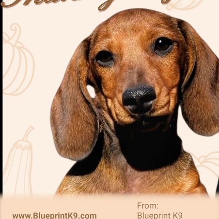 I have had dachshunds all my life, but never had a dachshund quite like Blueprint K9's. Her dachshunds are the prime example of the breed and what they are bred for!! Amanda goes beyond what ive ever experienced, my puppy came home already almost completly trained. She was eager to learn, and even easier to train. Amanda was with us every step of the way for any questions and even inspired us to look into different dog sports with our mango and she loves doing it!! We chose Blueprint because of their dedication to the breed, all her dogs are geneticlly health tested and have CHIC numbers. We couldnt be happier with our new family member and I will recomend Blueprint time and time again!!!!