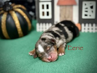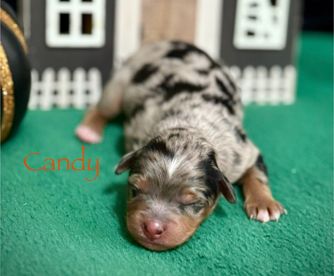 Our Aussiedoodle puppies include blue merle, black and white, and black tri-color. Miniature Australian Shepherd puppies include red & white, black & white, blue merle, black tri, red tri, and red merle. Colors will vary depending on the parent dogs.
