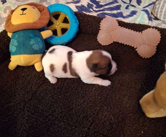 Calm patient demeanor makes him wonderful around kids. Black Jack is AKC registered with all the recommended health clearances. We love this little guy alot on our farm.