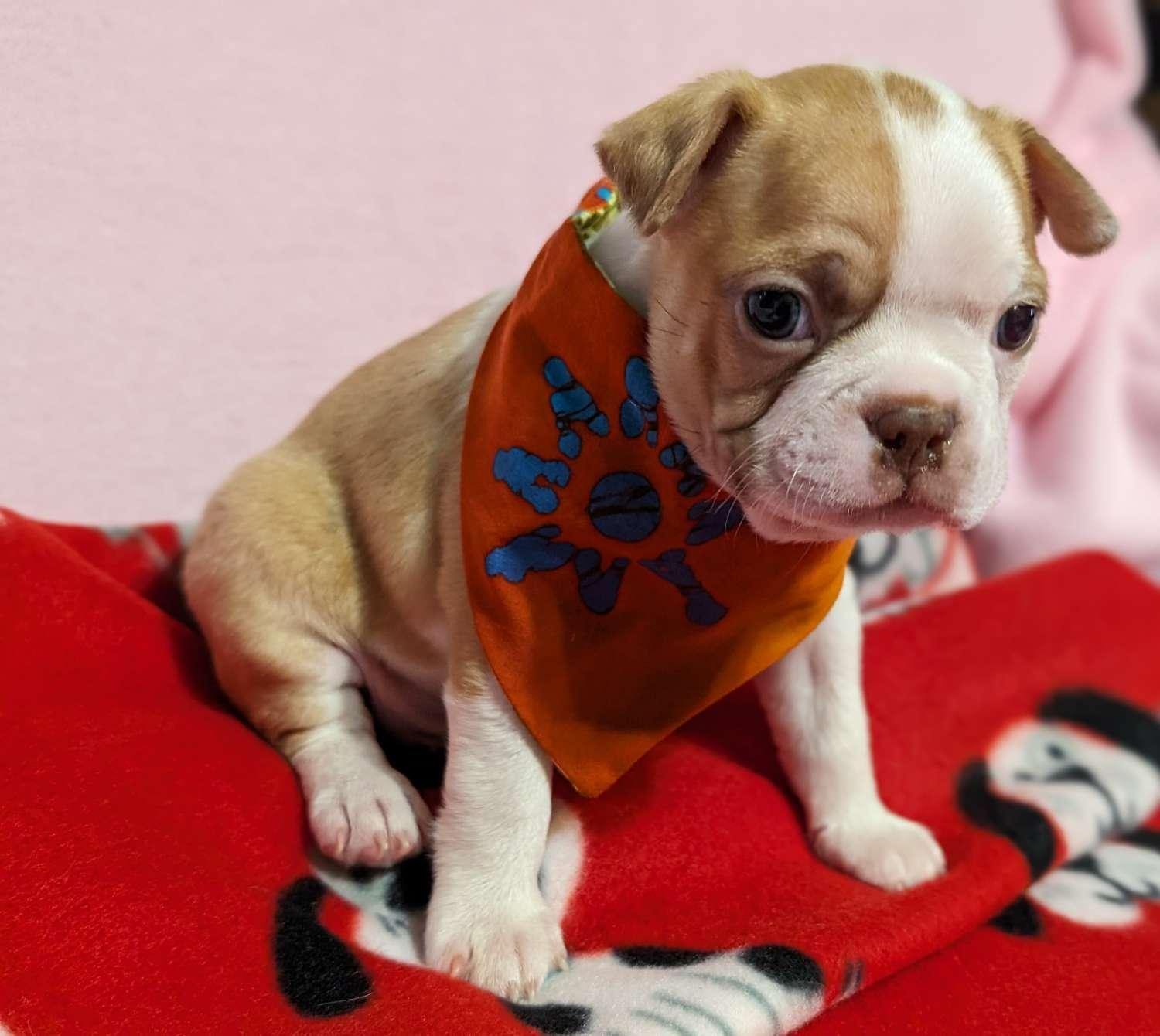 We contacted KIMMIE about one of her puppies about 12 days before the 8 week mark! She responded to our message within about one hour and we began corresponding and eventually calling and talking on the phone! We agreed to open our home/heart up to one of their puppies…..Radar. She asked if we would keep that name and we told her we would change it to Lug-nut!! She laughed but, agreed……she immediately started calling him Lug-nut in the videos!! We drove to pick him up on Saturday Oct 19 and it was great to see and meet his parents on site….along with the rest of their puppies! She provided us with all his records, shot info and a wonderful to go bag made by her! It is evident she cares for her puppies as Lug-nut left with a bandana, puppy blanket and other goodies! She provided us with a lot of useful tips, ideas and info pertaining to Boston Terriers! Overall, we had a great experience with BOGANs Bostons and would recommend them to anyone looking to give a home to a quality Boston!!!
