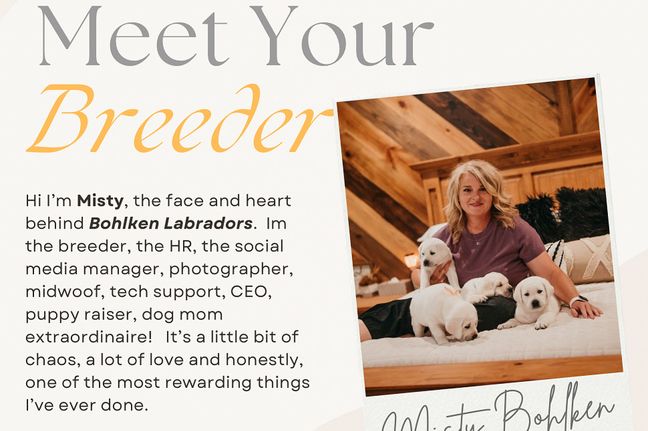 I'm Misty B., the breeder behind Bohlken Labradors located in Mt. Vernon, TX. We’re devoted to ensuring there are healthy Labrador Retrievers for others to enjoy and we do so by responsibly growing this incredible breed. We are home-based breeders dedicated to bringing healthy, loving, and high-quality Labs into the homes and hearts of their forever families. We love our dogs and are passionate about raising our puppies to be the best family companions.