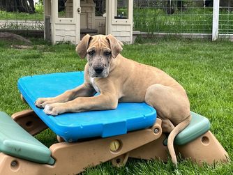 Beautiful brindle lady! She is very sweet and well behaved. She has a burst of energy when excited, but is short lived as any Dane! Nice tall girl, she is now retired from breeding.