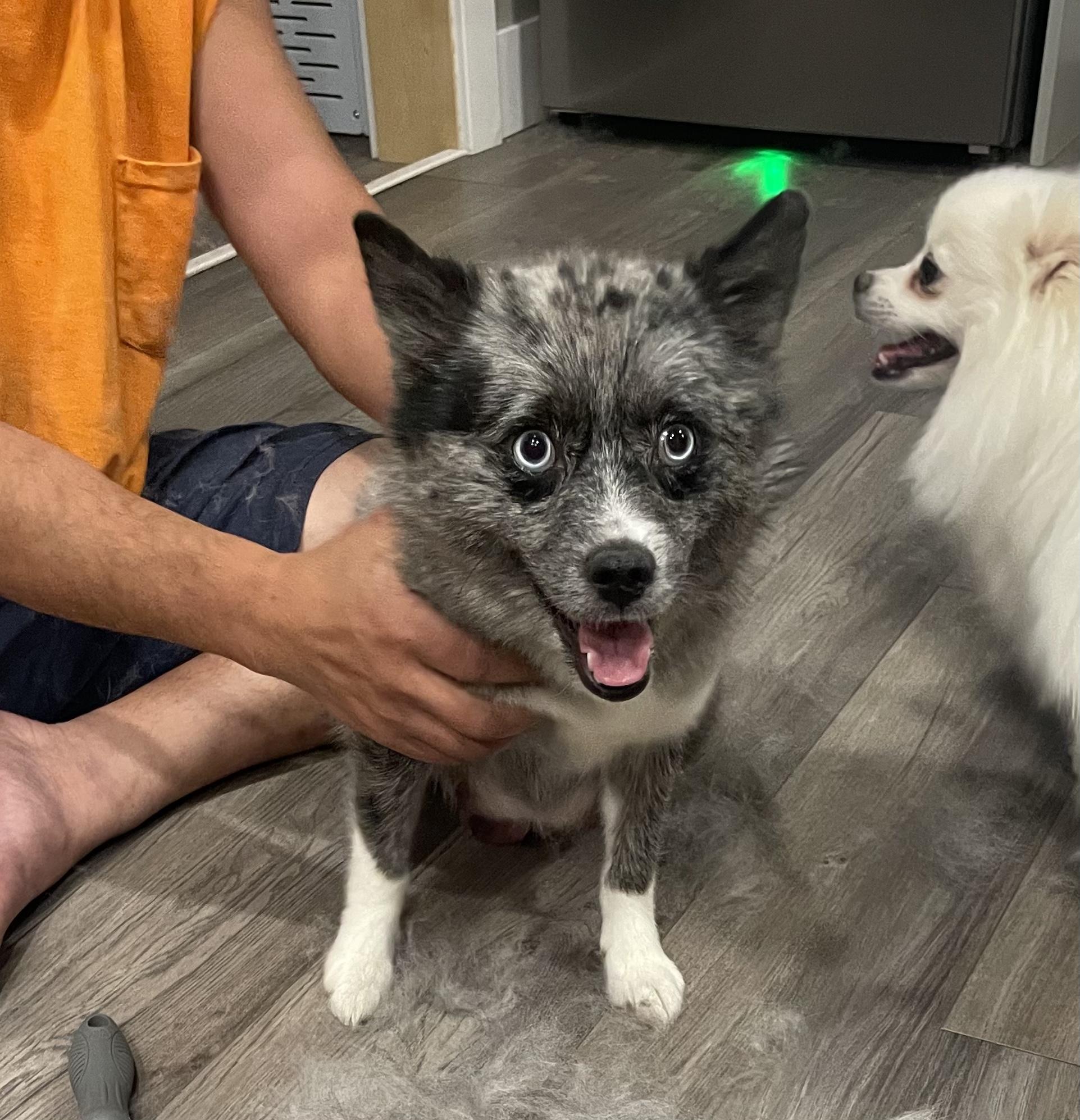 Beautiful silver Merle! Ultra fluffy with double blue eyes. Standard size coming in about 32 pounds. Incredible loving but will occasionally talk back 😂