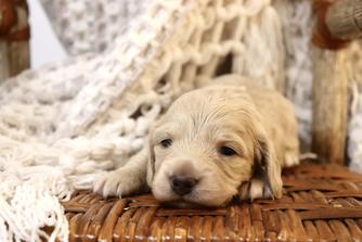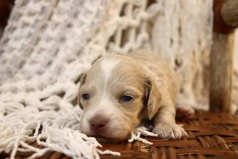 Dallas is a well built cream long haired miniature dachshund known for producing beautiful, healthy, and even tempered puppies. He has an excellent coat with strong feathering, rich cream coloring, and classic dachshund features, including a balanced frame and expressive face.