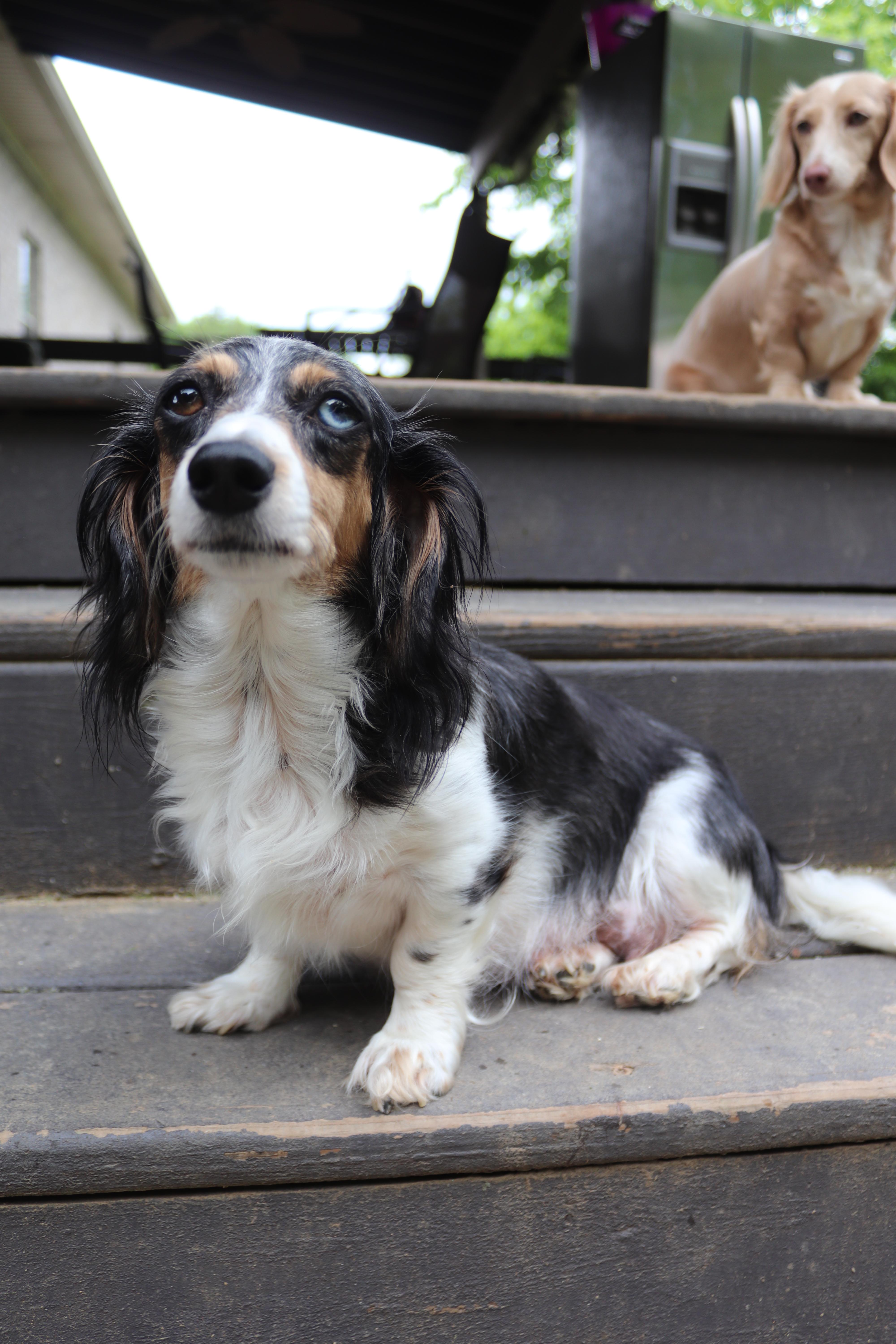 Sprinkles is an exceptionally affectionate, attentive, and loving long haired miniature dachshund. She has a beautiful coat with rich coloring and classic dapple markings, paired with a well proportioned frame and sweet, expressive eyes.
