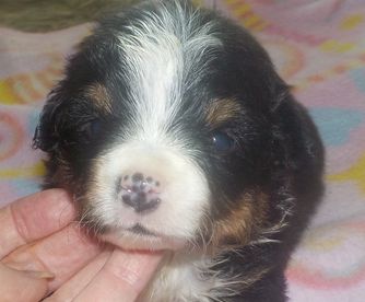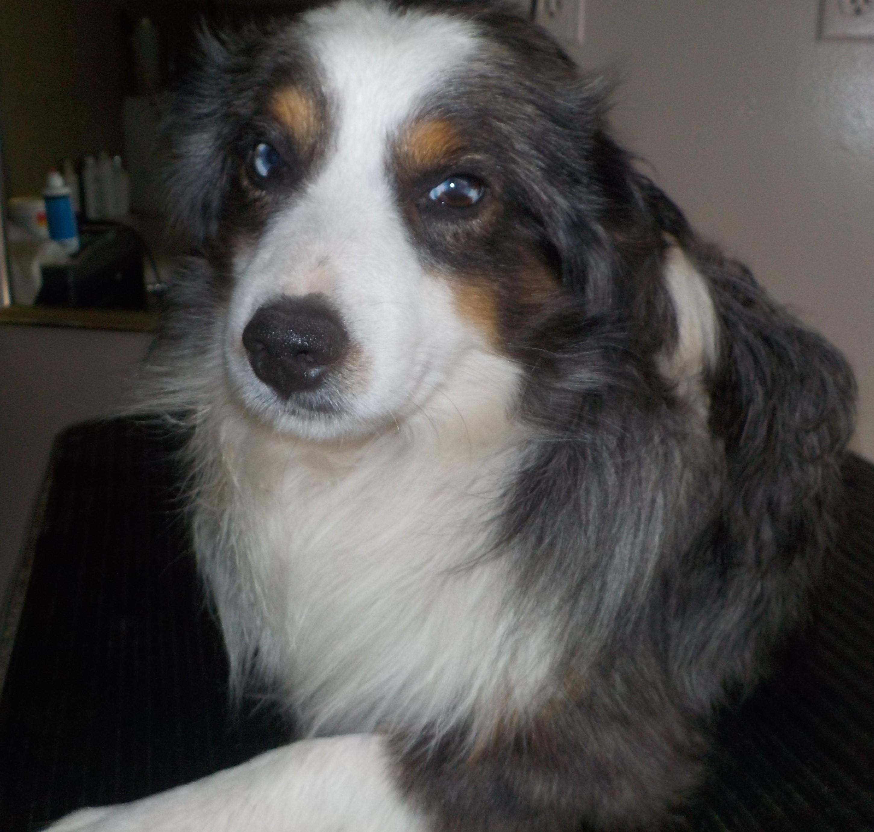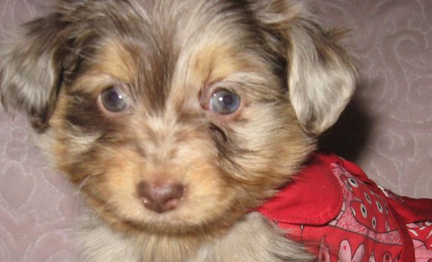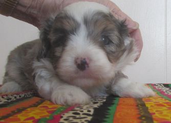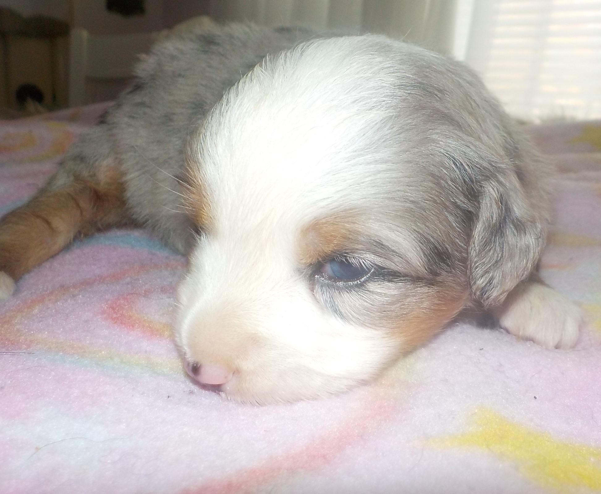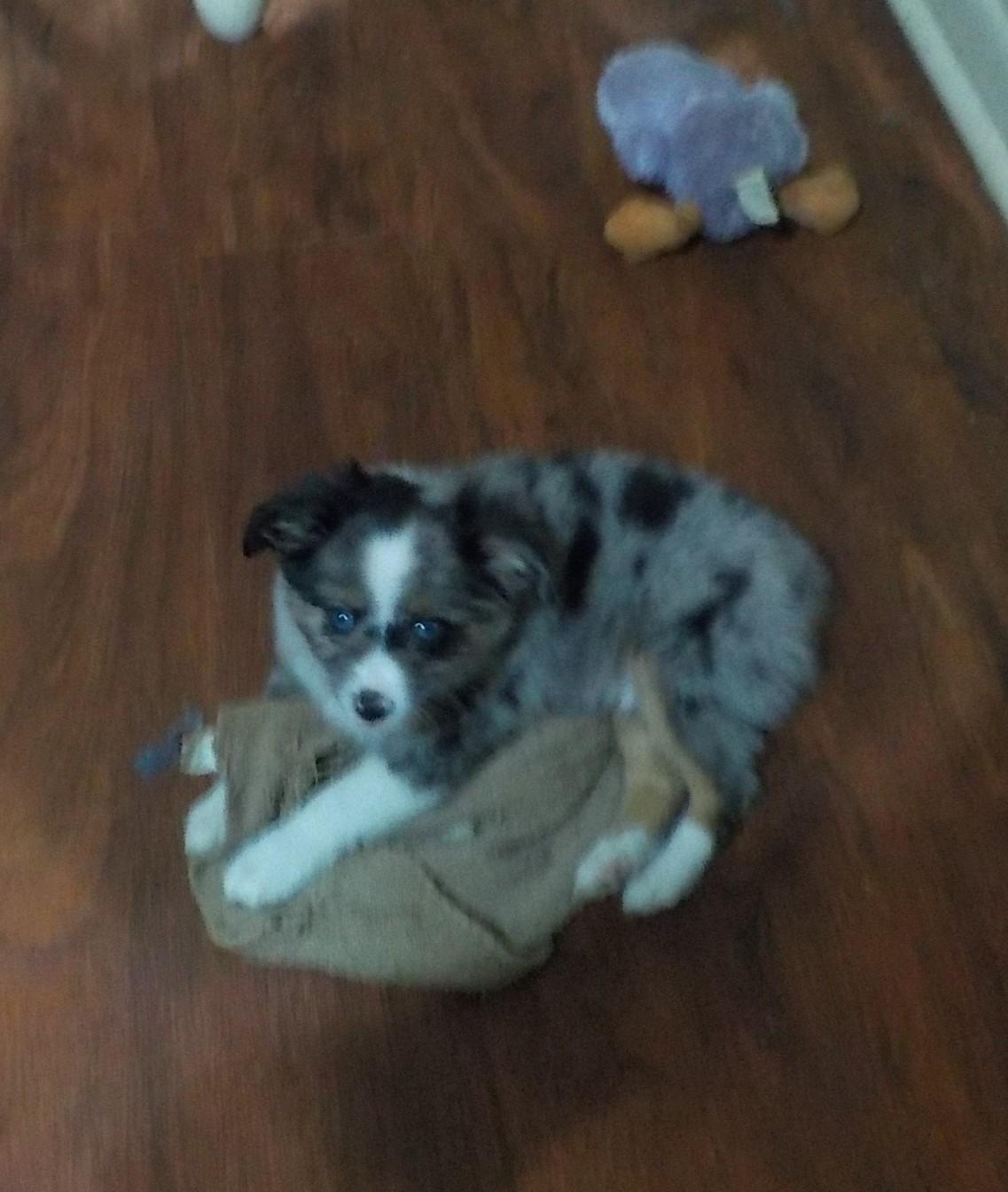 Sweet silly Phoenix has a side grin when she is pleased with herself. She likes to do things the same way and at the same time, which makes her easy to understand. She her color of blue merle is bright and well pigmented. She is a real tiny beauty.