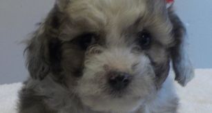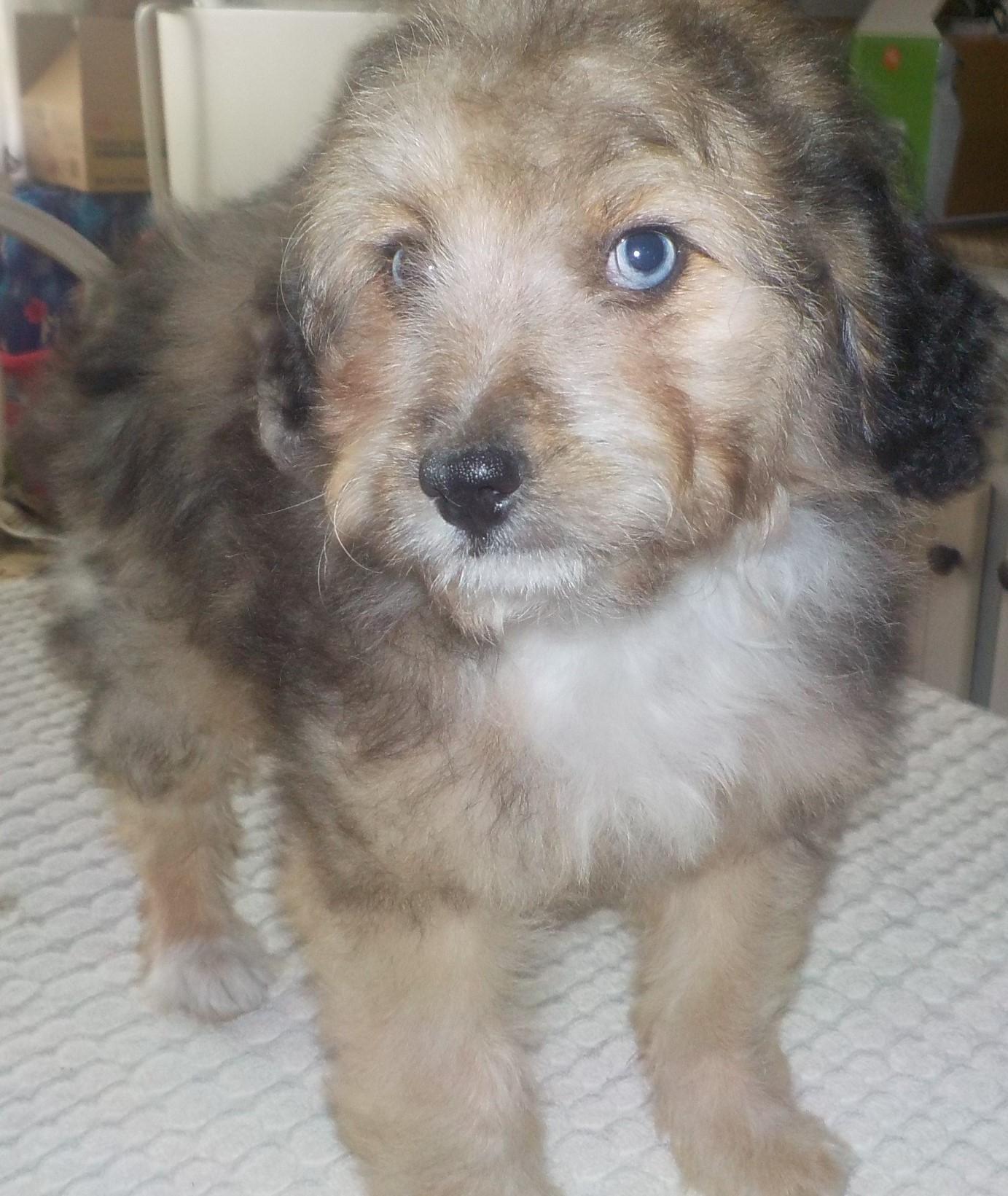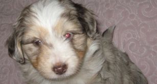 Our Aussiedoodle puppies include blue merle and black and white. Toy Australian Shepherd puppies include black tri, blue merle, red merle, and red tri. Colors will vary depending on the parent dogs.