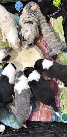 Our puppies include tri-color, gold merle, lilac merle, slate merle, blue merle, red merle, black, blue, gold, lilac, red, saddleback sable, white and blue, white and blue merle, white and red merle, slate, and white and gold. Colors will vary depending on the parent dogs.