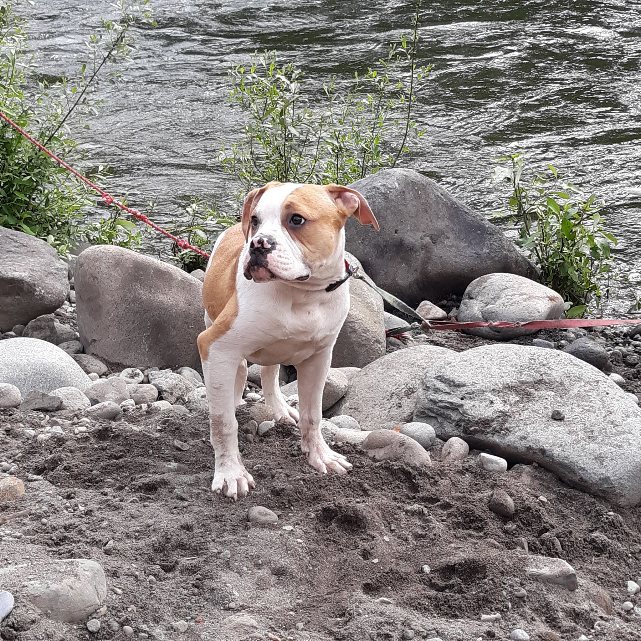 Dozer is a male American Bulldog. Carefully selected as a great representative of his breed, Rachelle decided to make him part of their program. Rachelle has passed Good Dog’s screening process, which involved a review of their breeding practices, environment, and the mental and physical health of their dogs.