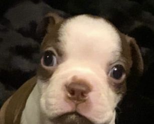 Charlie is a beautiful red and white Boston Terrier. She is a bit on the taller lean side in build. She is very smart and loves to play with you. She is very lovable and always runs the show. She loves everyone and other animals except for cats. She does not like cats at all! She knows alot of demands and is eager to please you. She is full of energy and loves to roll around and rub your furniture to death. She loves to watch TV and will at times try to interact with what's going on.