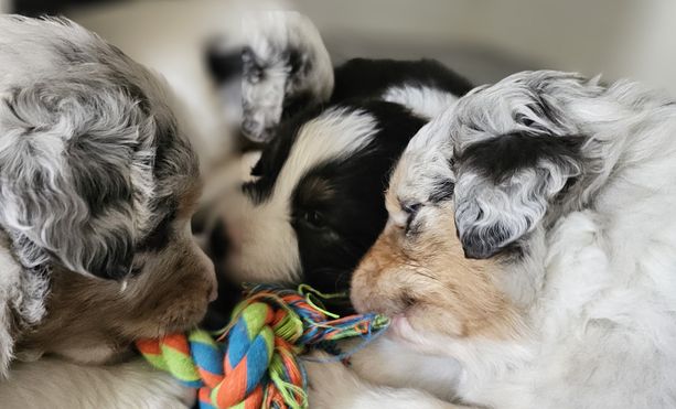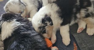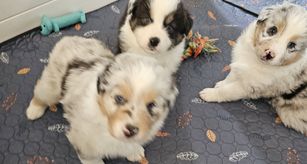 Our puppies include blue merle and black tri-color. Colors will vary depending on the parent dogs.