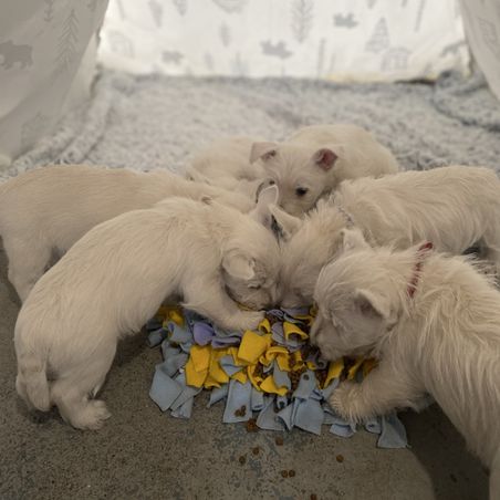 Our experience with Anita truly could not have been better. Our family had been doing research on different dog breeds for years, and then, finally, I stumbled upon a new litter of Westie pups on Anita’s profile on Good Dog and immediately fell in love with one of the photos. The timing was perfect to surprise our kids with a Christmas puppy, and Anita made the process so seamless and easy. She was so communicative with us throughout the whole process, sending frequent photos and videos and messages full of good information and useful resources. From minute one, he was crate-trained (!); we were shocked that he slept happily in his crate through the night without a peep. He is so sweet and social. He loves people and other dogs and has never displayed a hint of aggression. We could not recommend Anita more: she is clearly such a capable, loving breeder, and, from a business standpoint, she knows exactly what it takes to create a positive customer experience. When we’re ready for a second dog, we will definitely return!
