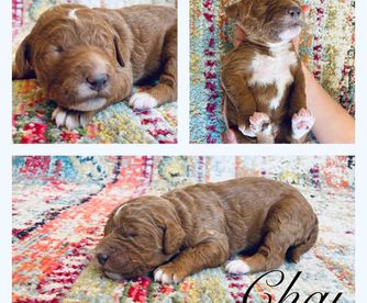 Our Goldendoodle puppies include cream, apricot, red, merle, and parti. Aussiedoodle puppies include blue merle and black and white. Colors will vary depending on the parent dogs.