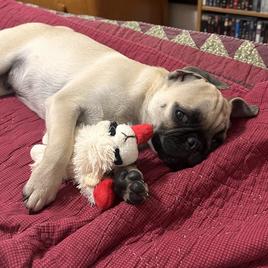 Elmo is amazing he is very cute and loves to cuddle, loves kisses and his toys I might have spoiled him with too many toys but he was worth it. I would recommend Braidi’s Pugs if anyone is interested in pugs she really cares for them dearly my little guy shows that tremendously with the love he shows us, I couldn’t ask for any little boy better than the one I got.