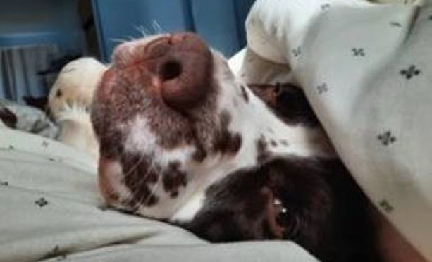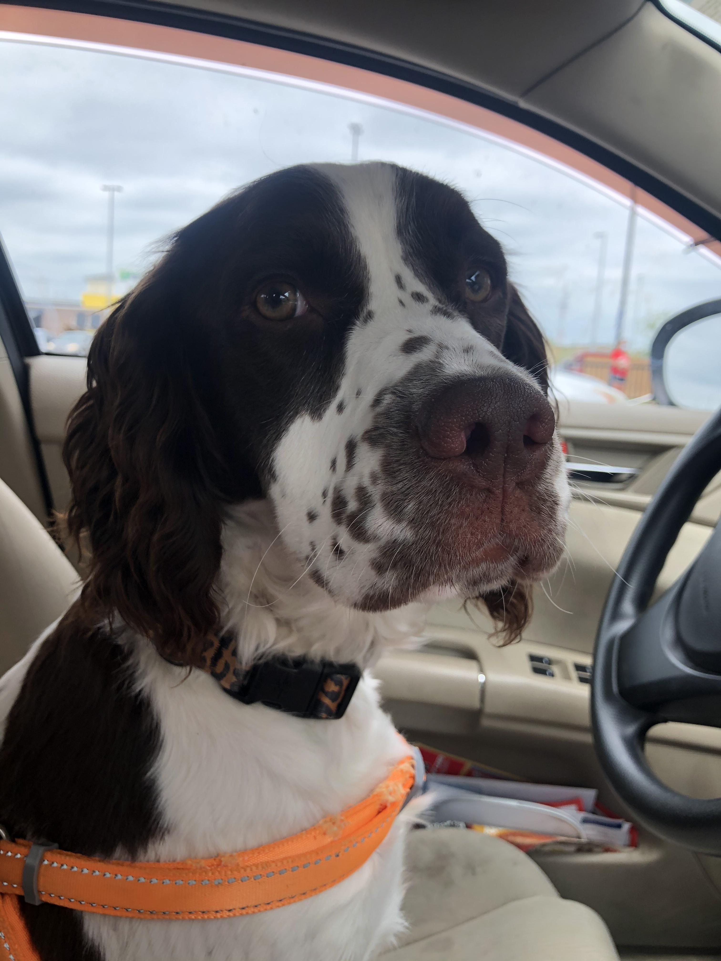 May is a lively and playful liver and white dog. She has a very wavy coat and is small and compact in size. She has a significant amount of ticking throughout her legs and face with next to none on her torso. She has shorter ears and is an incredibly loving dog.