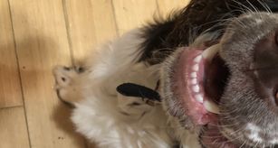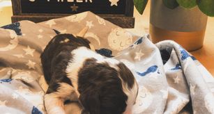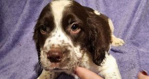 Hank is liver and white with lots of ticking on his face and legs. He is an incredibly smart and sweet-tempered boy who loves to cuddle. He has a long, mostly straight coat with long feathering on his legs and very curly ears.