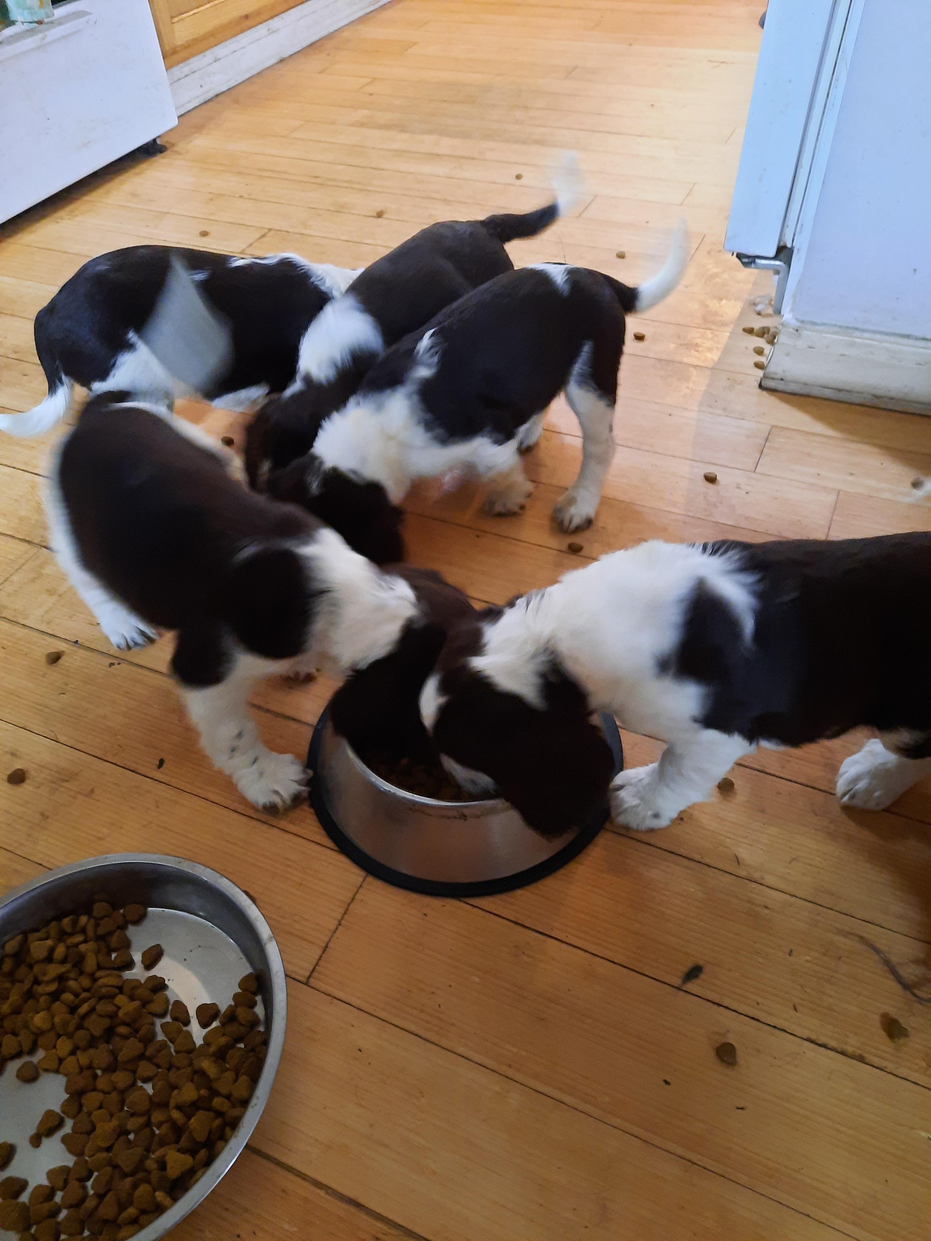 Chicory is a black tri color bench springer. She has heavy ticking throughout her coat in both black and tan spots. She will be bred no earlier than Spring 2022 pending genetic test results.