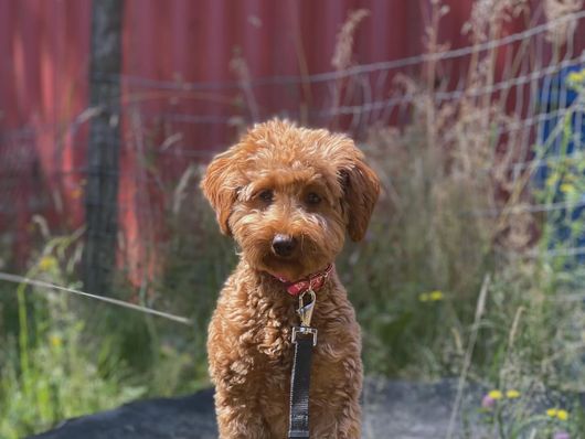 Chewy is the sweetest doodle . She loves her treats and people . Her favorite place is to be is laying beside you or throwing her toys around . She is just under 15 lbs , has the softest red coat . She has passed her OFA Heart, Hip, Elbow, and Patella.
