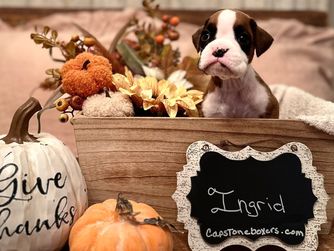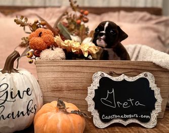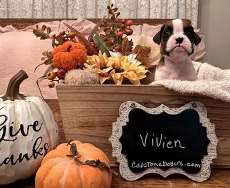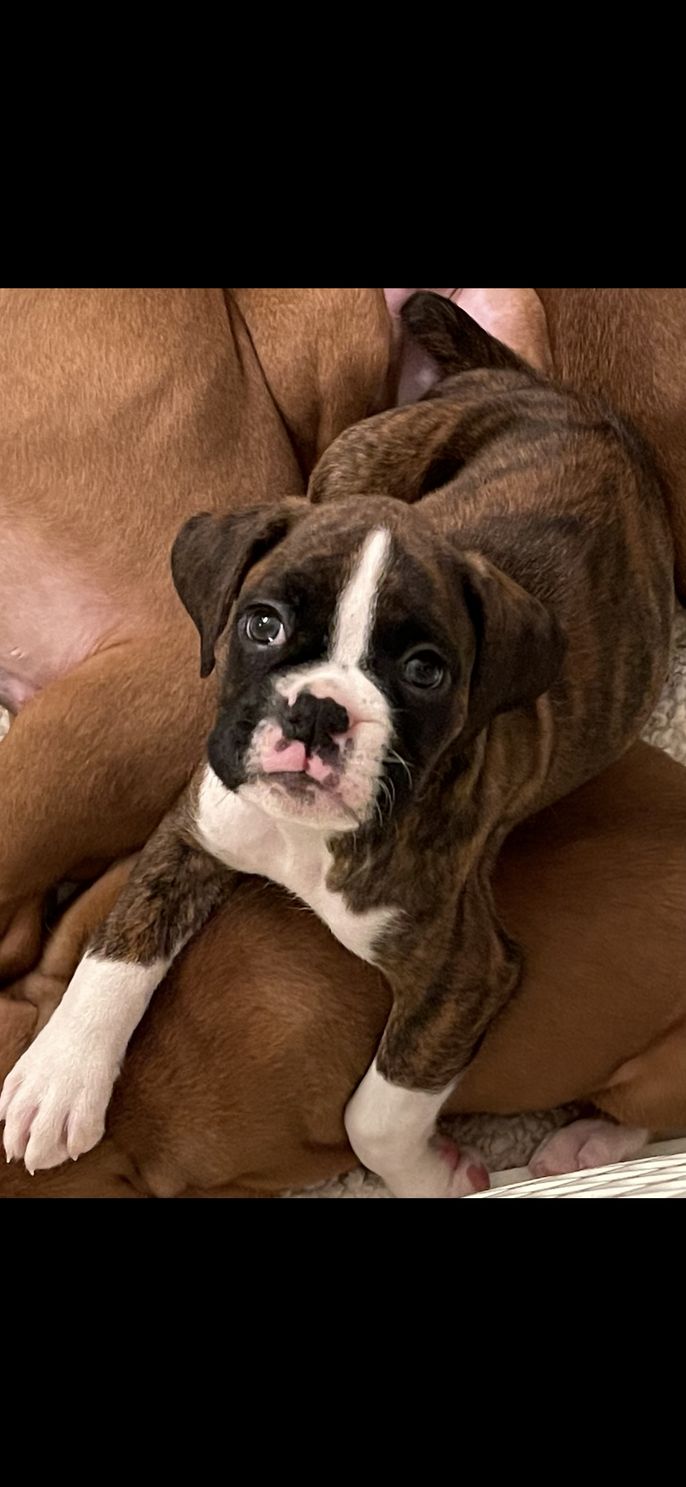 Sophie is registered AKC. She is a lovely brindle boxer. Sophie was born to a litter we had in 2021. She has a lovely temperament and is very intelligent. Sophie’s ancestry has many champions and her bloodline is excellent. Sophie is a beautiful brindle Boxer with striking flashy white markings that highlight her classic elegance. She carries herself with confidence and charm, showing off the best of the breed’s athletic build and expressive personality. Sophie is not only eye-catching in appearance but also known for her affectionate nature and playful spirit. Her balance of beauty, intelligence, and loyalty makes her a wonderful representative of the Boxer breed and a cherished part of the family.