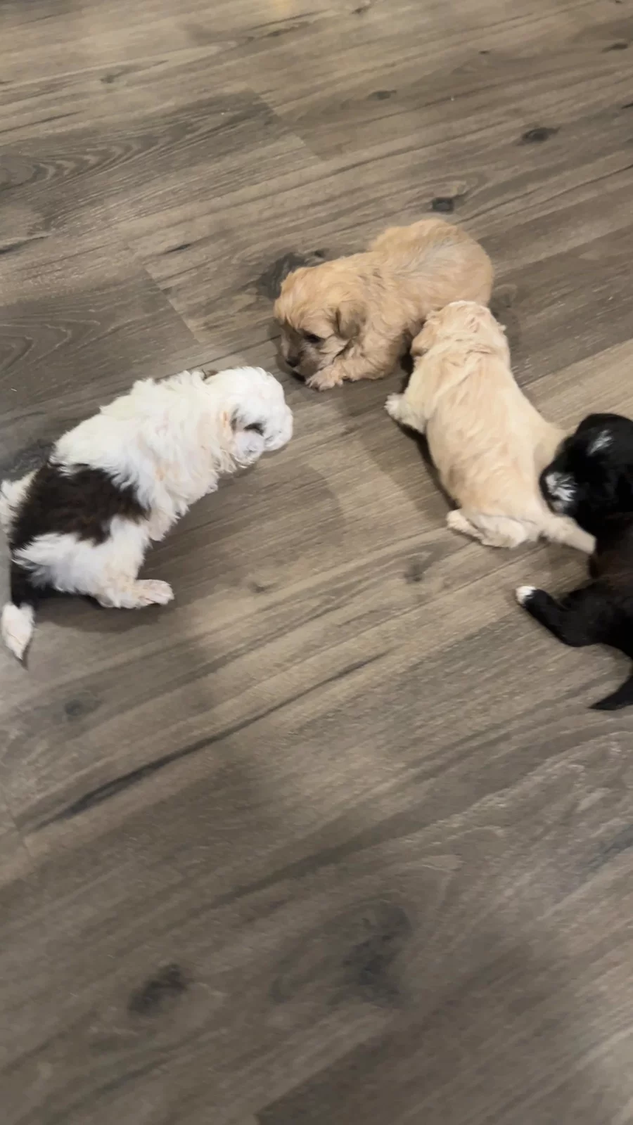 As the puppies begin to walk we are familiarizing them with different walking surfaces today, surface hardwood floor!