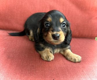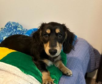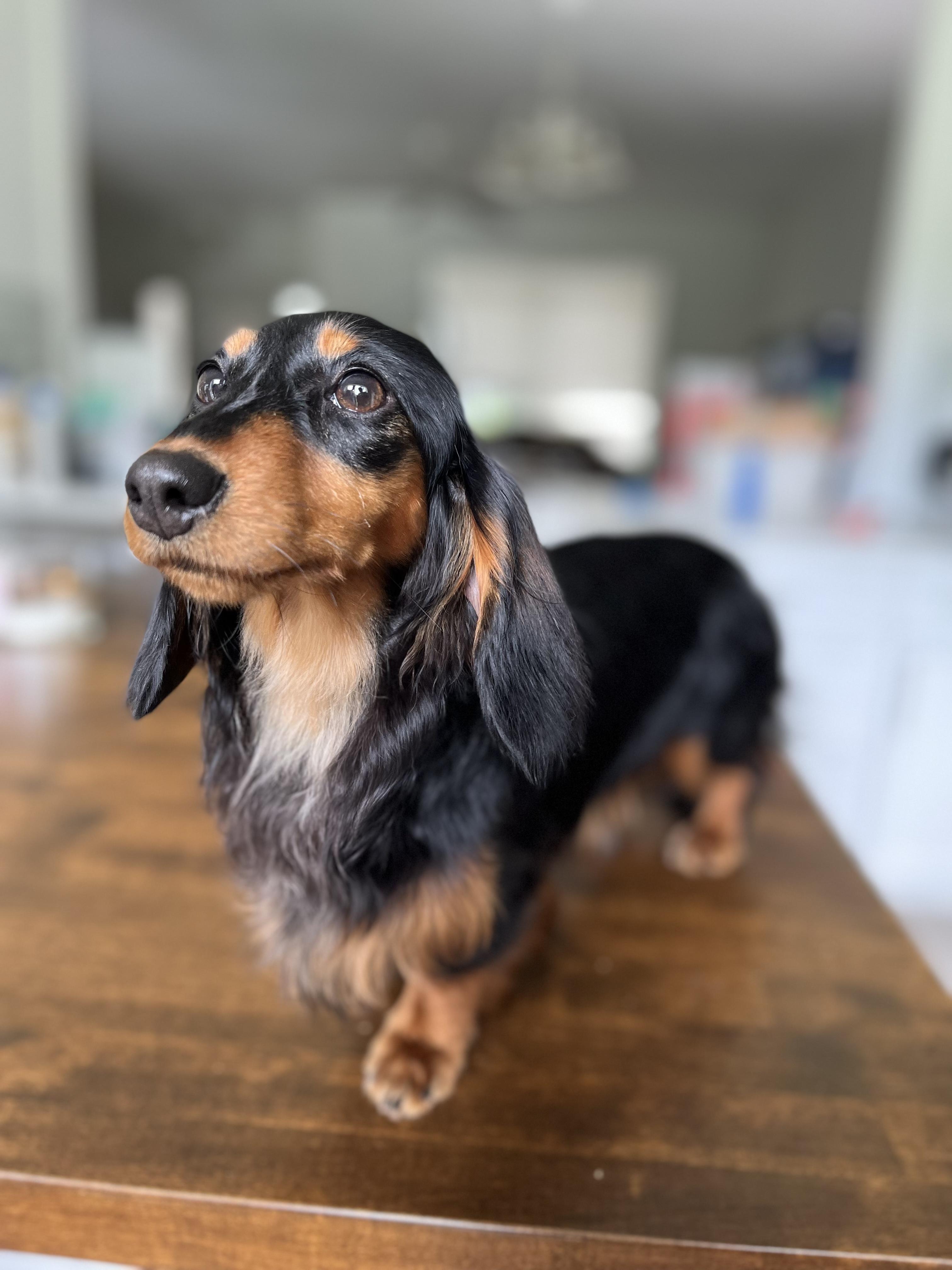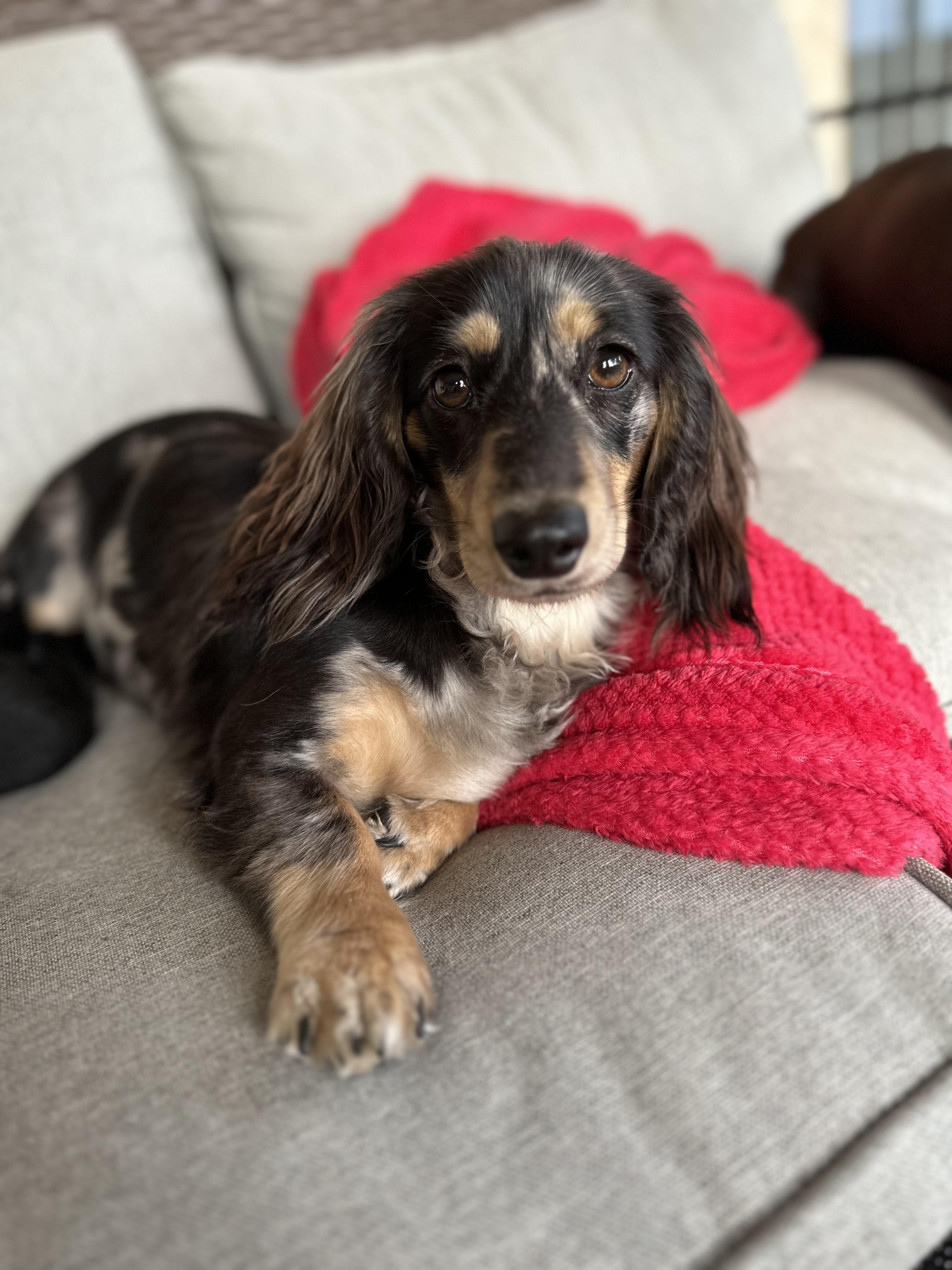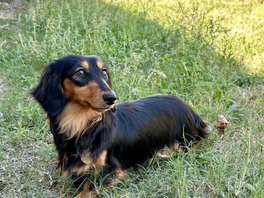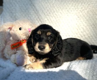 Tabie is a beautiful girl with a wonderful coat. She is so sweet and loves to play. When she gets excited she likes to give us a smile! She is a black and tan longhaired miniature dachshund. She is AKC registered and from a wonderful line of champions.