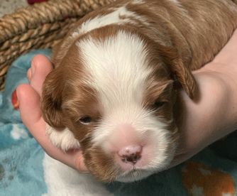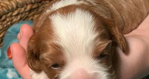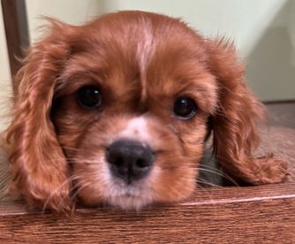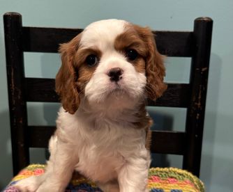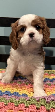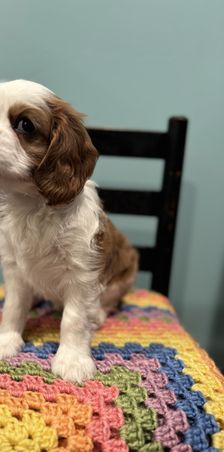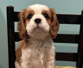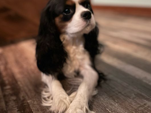Charlie is a tri colored King Charles Cavalier. She is a lively and playful girl. She loves playing fetch and always wants to be by your side. She is AKC registered and OFA health tested.